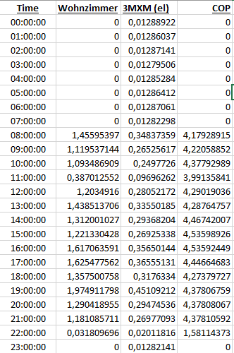 Eurovent-Daten linear interpoliert. Ist nur eine Näherung, bei der ich die elektrische Leistung abzüglich der Standby-Leistung und der Stromaufnahme des Lüfters mit dem COP laut Eurovent multipliziere. Die ersten zwei Minuten nach Start der Anlage bleiben auch aus der Wärmeberechnung raus.