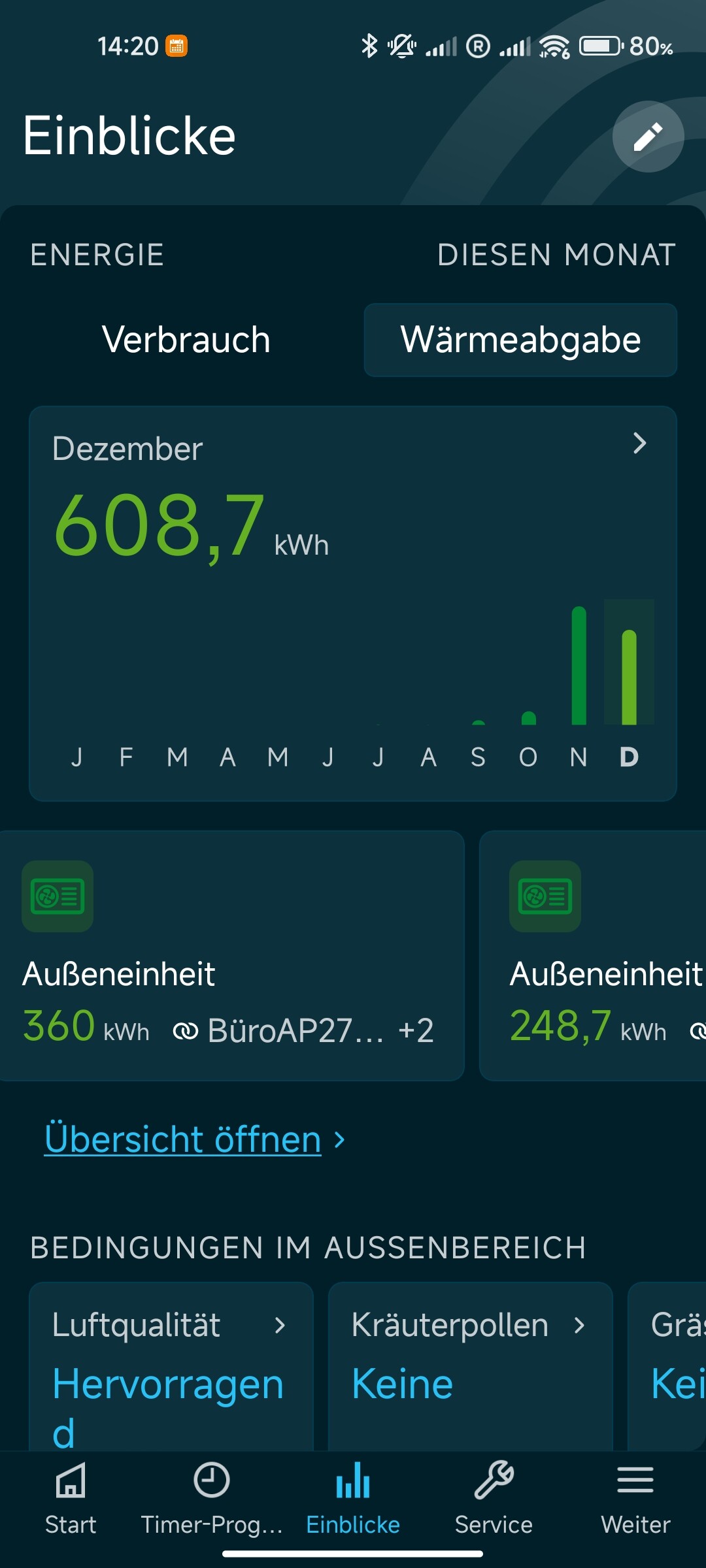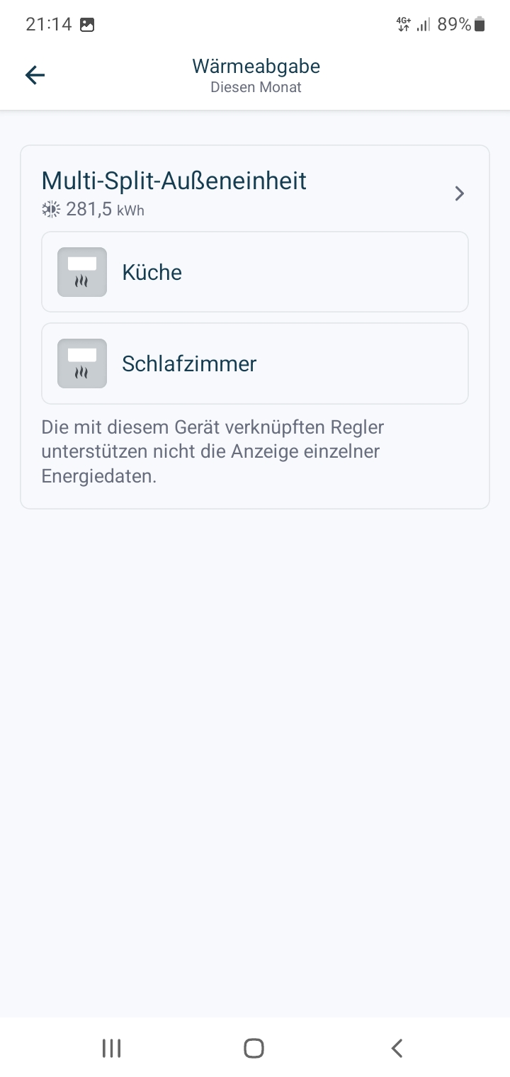 Bzw habe ich ein Spezialthema: ich habe ja 2 Außeneinheiten an denen je 2 IG hängen, siehe meinen Vorpost. In der App sehe ich aber nur 1 Außengerät und bei diesem die gesamte Wärmeabgabe. Dh ev fehlt nur jene vom anderen Außengerät. Denn beim Verbrauchsschirm ist der Verbrauch aller 4 IGs angegeben.