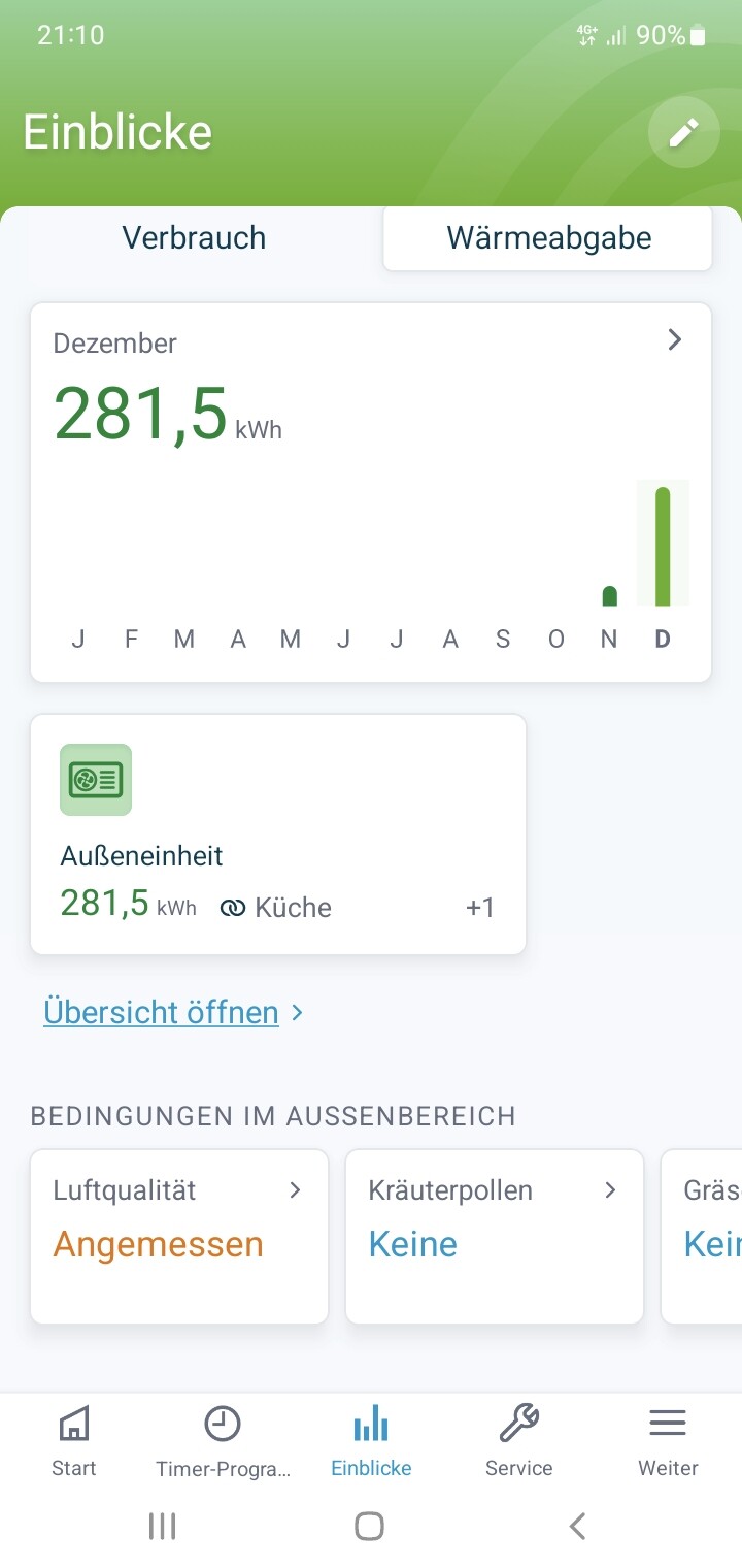 Es sieht so aus, als würden die AGs unterschiedliche Daten bereitstellen. "Wärmeabgabe" taucht bei mir in der Onecta-App überhaupt nicht auf. Dein letzter Screenshot lässt vermuten, dass das AG, an dem die "Küche" hängt, aus 78 kWh Strom 281,5 kWh Wärme erzeugt hat. Das entspräche einem COP von 3,6.