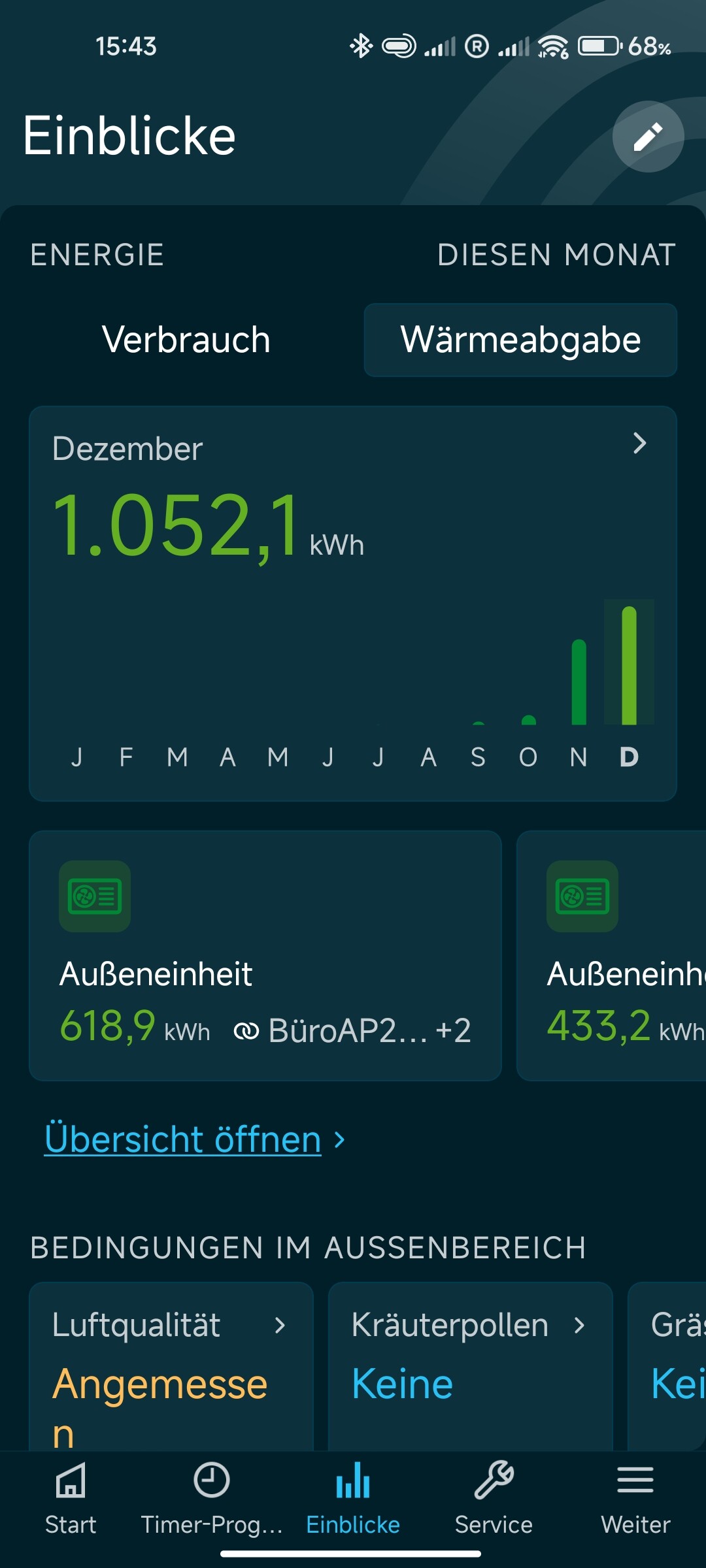 Das ist komisch. Wenn ich auf die Einblicke-Wärmeabgabe gehe, sehe ich die Gesamtübersicht und beide Außengeräte. Unter Übersicht öffnen sehe ich sie nochmal, allerdings ohne Einteilung nach IG.