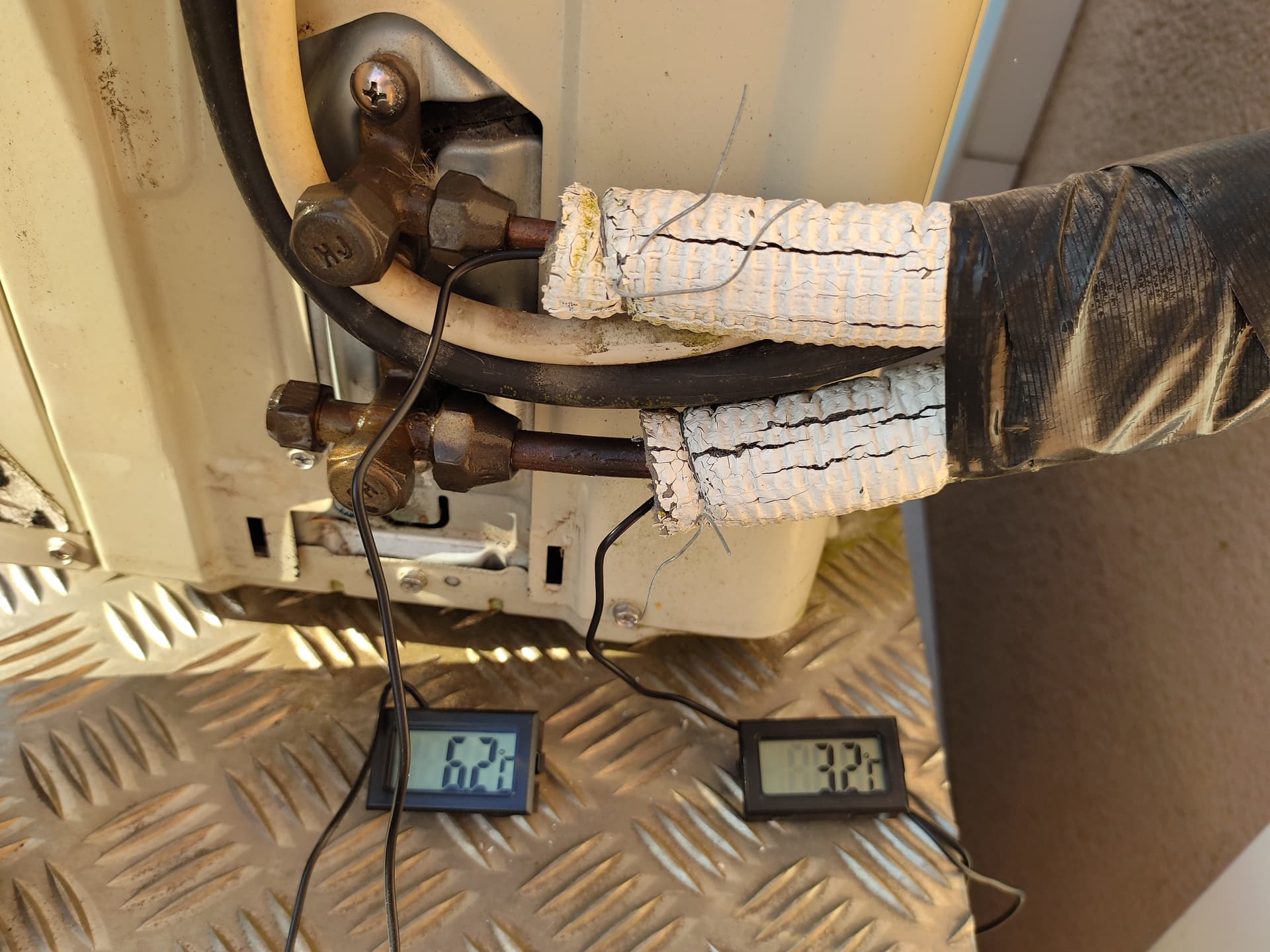 Das ist genau der Moment wo innen die Temperatur rechts und links so unterschiedlich ist und aussen dann diese Temperaturen an den Leitungen herrschen .und das ganze ist immer noch im Kühlbetrieb bei 16 Grad und Max Lüfter.