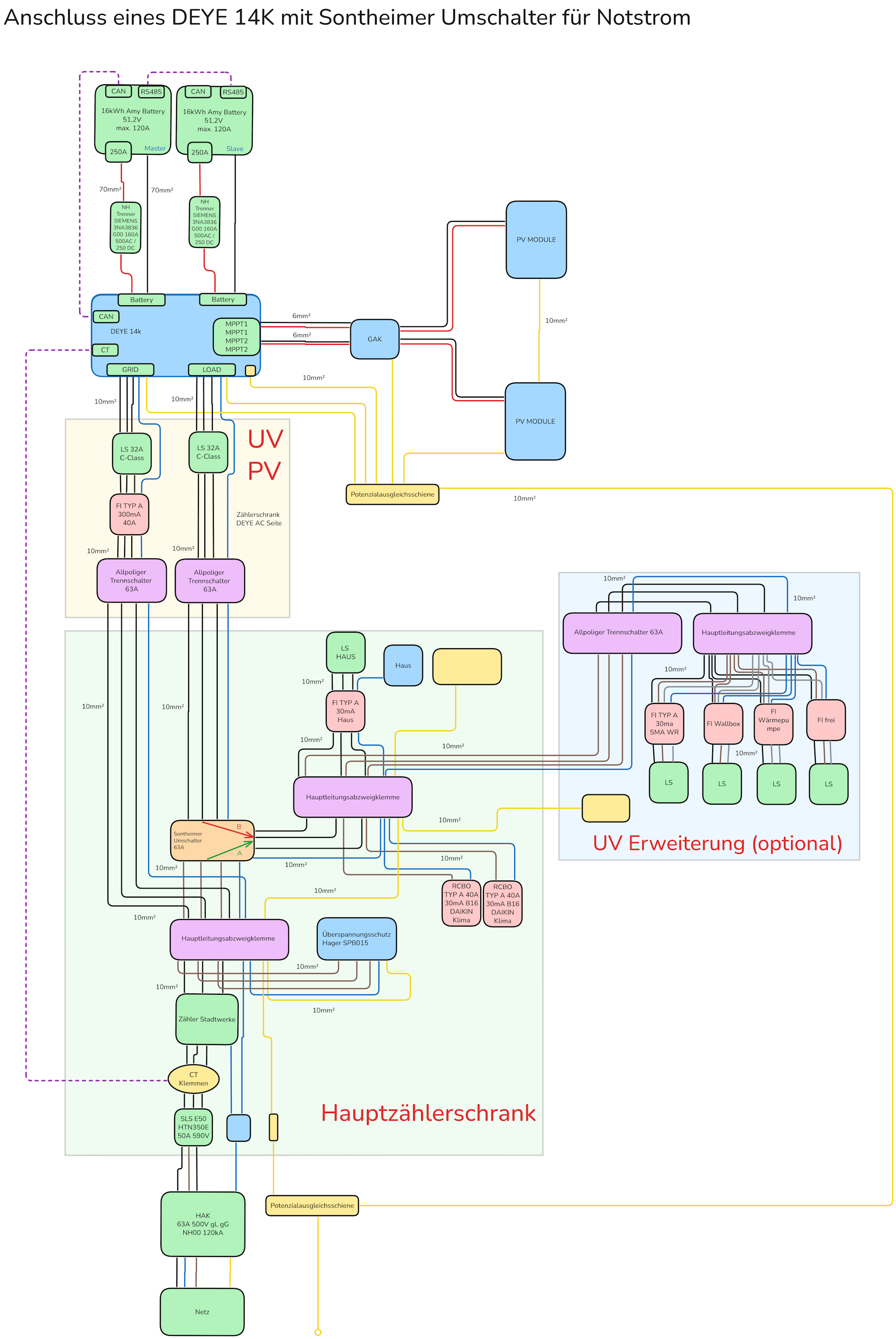 Vielleicht sollte der Hauptpfad mit 50A abgesichert werden, aber dann kann ich nicht mehr den Deye mit 45A AC Durchgang verwenden, sondern müsste z.B. auf den SUN-14K-SG05LP3-EU-SM2 wechseln (leider wieder 200€ mehr). Der hat 70A AC Durchgang.