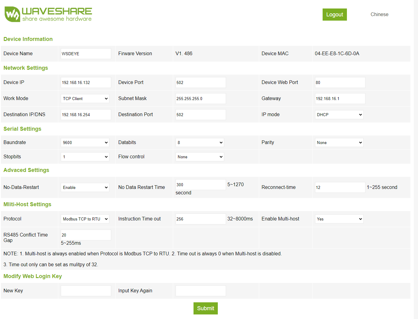mein 12k + Pylon Akku läuft mittlerweile so, wie er soll(abgesehen davon, dass er mangels Sonne nicht viel zu tun hat). Ich möchte nun gerne die Daten aus dem 12k für meine Heimautomatisierung verwertbar machen. Ein Weg ans Ziel scheint das Abfragen und Verändern der Daten per Modbus zu sein. Zu diesem Zwecke habe ich mir ein Waveshare Modbus zu TCP Adapter besorgt. Leider bringe ich bisher keine Modbus Abfragen zum Laufen(Connection Timed Out), was auf falsche Verkabelung hindeuten soll.