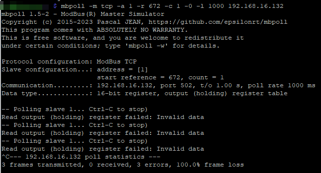 mbpoll -m tcp -a 1 -r 672 -c 1 -0 -l 1000 192.168.16.132
