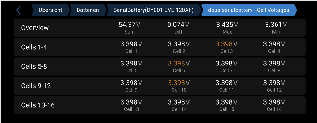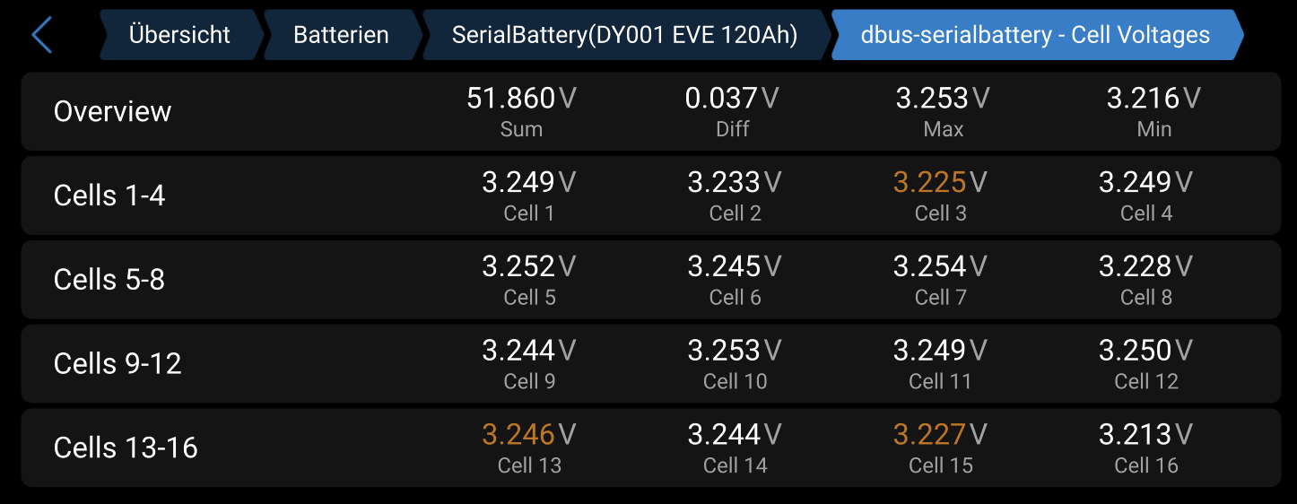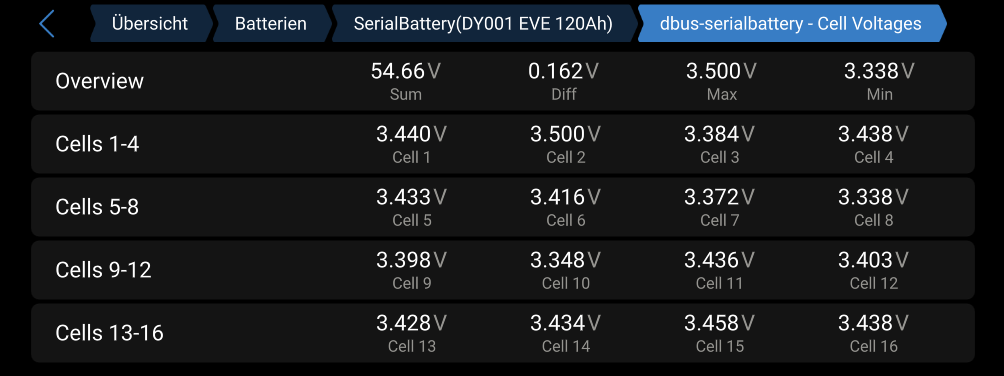 Ja, wenn die Baterie stark disbalansiert ist, helfen diese Parameter wenig, weil das DEYE-BMS die Batterie früher abschaltet, als diese Zellspannungen überhaupt erreicht werden können. Deswegen könnte es tatsächlich hilfreich sein für den ersten Aufladevorgang (oder für die ersten 2-3, wenn sie zu schnell gehen) die Spannungen etwas tiefer zu setzen, wie ich es oben geschrieben hatte.