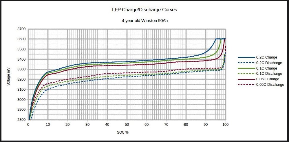 . Ich habe dazu natürlich auch noch einen Log der sekündlich Spannung, Kapaität usw. aufgezichnet hat und das deckt sich ziemlich gut mit dem Diagram von oben mit einer C-Rate von 0,2C. Zu beachten ist auch das Winston Zellen generell stabiler in der Spannung als die bekannten "Blauen" sind... was aber nicht heißen soll das die "Blauen" schlecht sind, vorallem für den Preis wenn sie denn lange halten.