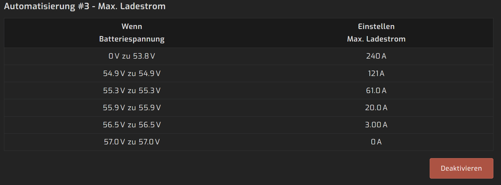 - Die vom DEYE-BMS vorgeschlagene Ladekurve im oberen SOC-Bereich eingrenzen, sobald der Umrichter es zulässt. Das führt im Wesentlichen dazu, dass nicht, wie von DEYE vorgeschlagen bis zum bitteren Ende mit 10A geladen wird, sondern die letzten 5%-10% SOC mit einem reduzierten Strom geladen werden (s. oben, wurde gerade tabellarisch erklärt). Das führt dazu, dass der Balancer (egal ob der interne oder der “hinzugebastelte”) deutlich mehr Zeit hat, die Zellen zu balansieren und nicht so, wie von DEYE umgesetzt, indem der besagte SOC-Bereich recht schnell “überflogen” wird (sind manchmal wirklich nur 10-15 Minuten, was eindeutig zu wenig ist), sodass die Balansierung nicht vernünftig durchgeführt werden kann