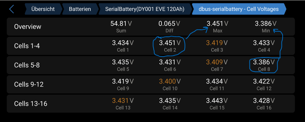 Die Spannungen hatte ich übrigens mit Multimeter nachgemessen. Passt von der Größenordnung und ja, dass ist genau die Zelle, die du da auf dem Bild markiert hast. Allerdings sind die Spannungen von DEYE-BMS etwas höher. Z.B. misst mein Multimeter exakt 49 Volt, DEYE-BMS meldet aber 49,3 Volt, wie man auch meinen Screenshots entnehmen kann. Und nichts von wegen ungenaue Messung und irgendwelche Spannungsabfälle: Ich hatte da direkt in der Batterie an den Schienen gemessen. Auch die einzelnen Zellspannungen sind entsprechend etwas kleiner. Bei der besagten Zelle wäre sie unter 2,7 V, obwohl DEYE-BMS 2,74 V meldet. Und ich hatte meinen Multimeter eigentlich irgendwann mal überprüft. Damit hatte ich auch mein Stütznetzteil kalibriert und wenn ich dem 49 Volt als Sollwert vergebe, dann liefert das Netzteil auch exakt 49 Volt und nicht etwa 49,3 Volt, wie DEYE-BMS es meint. Also noch eine Schwachstelle von diesem beschießenen DEYE-BMS.