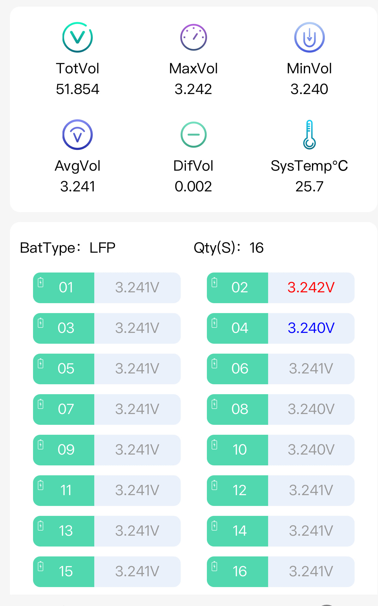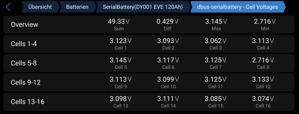 Die 3mv Spannungsdifferenz in deinem Screenshoot oben bedeuten nichts, weil die Spannungen der Zellen bei ~3,31V liegen. Spannungsdifferenzen und somit auch Ladungsunterschiede siehst du erst richtung Lade oder aber Entladeschluss weil hier die Spannungen nach oben gehen da die Zellen voll werden oder aber einbrechen weil sie leer werden (Spannungskurve eines Lifepo Akkus anschauen!). Im mittleren Bereich kannst du gut und gerne 30% SOC Unterschiede haben und siehst nichts davon anhand der Spannungen