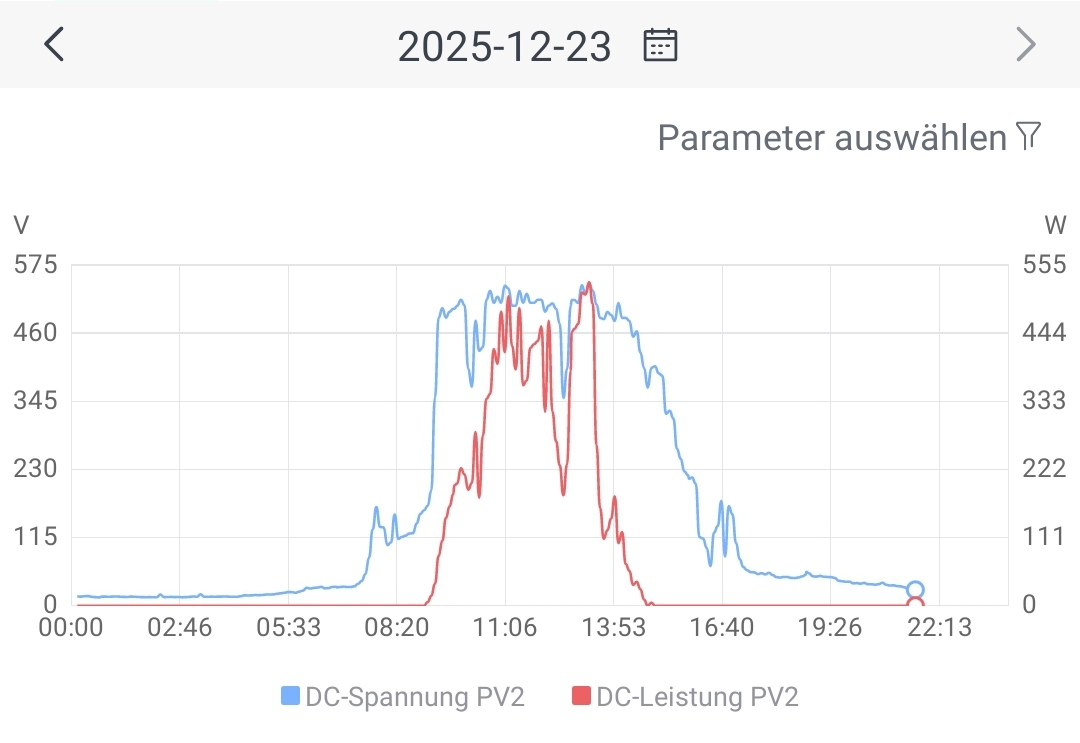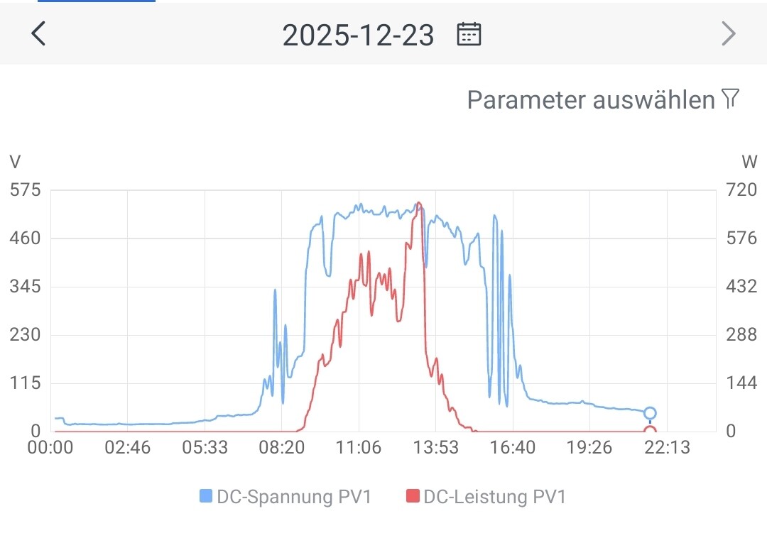derzeit kommt vormittags oft noch nicht viel Licht vom Himmel und ich beobachte, wann unser neuer Deye 15kLG053LP startet. Heute hat er erst ab ca. 11.30 geliefert, während unser Victron MPPT Laderegler schon seit 8.00 morgends arbeitet, wenn auch nur mit wenigen Watt. Die Stringspannung am Deye kommt nicht so hoch, aber es fließt schon ein Strom von ca. 0,4…0,5A - dadurch wird ein Anstieg der Stringspannung bei schwachem Licht erschwert.