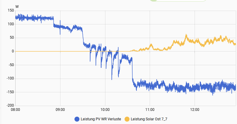 10.40 Uhr: ~150W PV Leistung werden verwendet um den Eigenbarf zu decken. Da der WR die PV Produktion für den Eigenbarf nicht ausgibt, ist der Wert negativ.