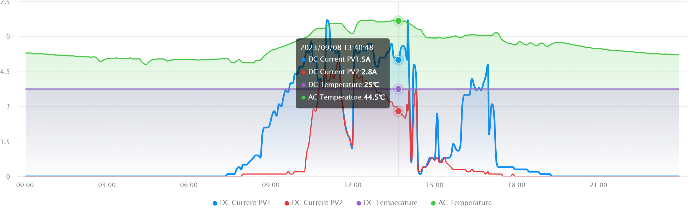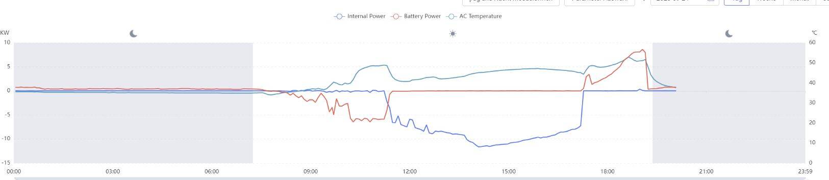 Ich nehme die oberen Kühlkörper für morgen raus, der Temperaturverlauf heute ist mit Kühlkörper. Der Berg am Morgen ist von der Batterieladung, der Berg am Abend war das Elektroauto der Tochter incl. Ladung aus der Hausbatterie ohne PV Unterstützung.