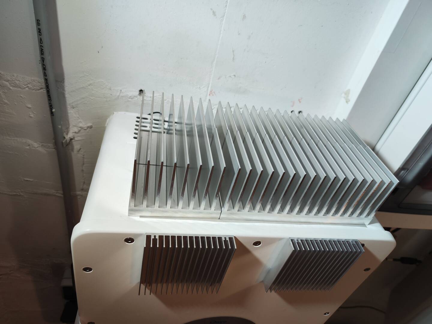 - Oben auf dem Gehäuse habe ich große Kühlkörper auf eine Wärmeleitmatte lose aufgelegt, insgesamt ca. 30x15x8cm, 4kg Alu :)