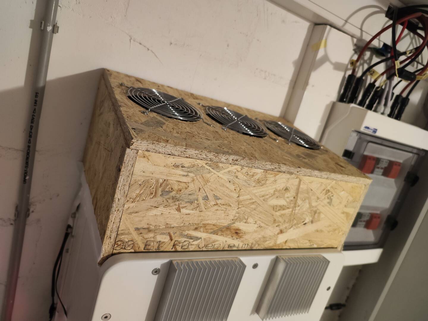 Der originale Lüfter funktioniert doch, hält den WR etwa bei <=50°, macht dabei etwas krach, vor allem weil er sporadisch anläuft anstatt immer und dafür geregelt. Aber wenn der Deckel drauf ist, ist das aus dem Keller nicht zu hören, zumal ja auch nur die Garage drüber ist.