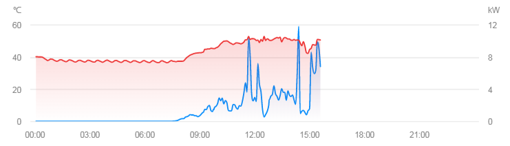 selten auch mal etwas über 40 ° und gaaanz selten (zu 18kw Spitzenzeiten....so um Mittag rum für ca 30 Min über 45°).... ich denke am schlimmsten ist für Elektronik