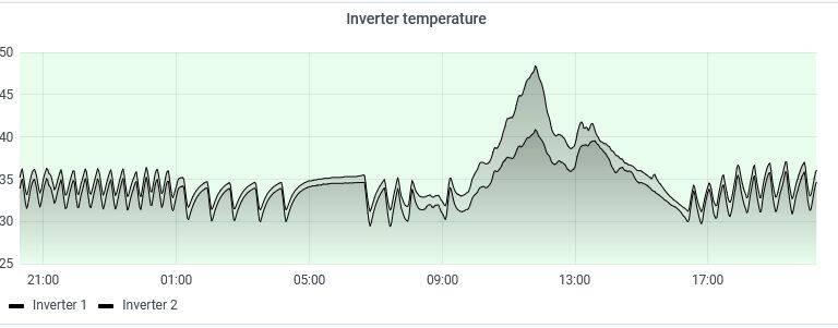 Man sieht, wie kurz vor drei die Temperatur von 51°C auf ca. 42°C sinkt. Da habe ich die Zusatzlüfter eingeschaltet. Dann kam die Sonne durch. Mit der Leistung stieg logischerweise auch die Temperatur. Bei 50°C sprang der interne Lüfter wieder an. Zur Zeit laufen die Lüfter ständig, eine Temperaturregelung ist nicht vorgesehen. Ich werde die Ventilatoren über den Shelly-Plug laufen lassen, morgens einschalten, abends ausschalten.