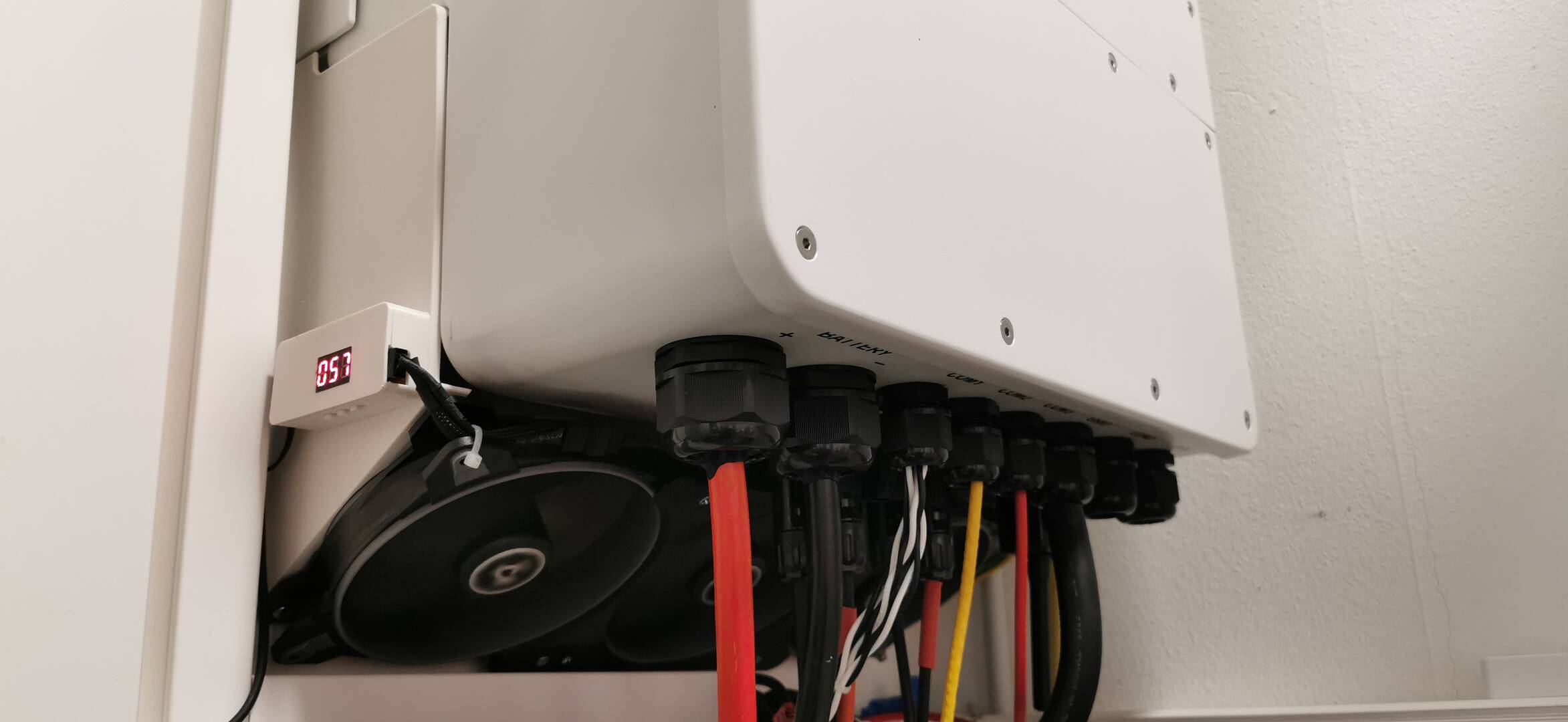 @Bart Die Innentemperatur des WR hängt stark von der Umgebungstemperatur ab. Mein WR hängt im Heizungsraum, jetzt wo die Sonne scheint und mehr als 12 kW vom Dach kommen, laufen die internen Lüfter permanent und die Temperatur liegt auch so bei 51-53°C. Ich habe zusätzlich 3 x 120 mm Lüfter unter dem Deye montiert. Testweise habe ich die Ventilatoren auch oben angebracht, um die Luft abzusaugen, aber das Ergebnis war nicht so gut wie bei den Lüfter unten. Ein weiterer wichtiger Faktor ist die Menge an Luft, die von den Lüfter bewegt werden kann.