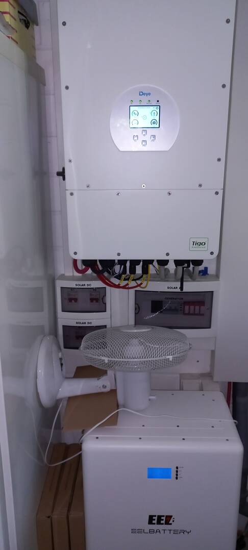 Das ganze funktioniert sehr gut und wurde so gebaut das am Deye selbst keine Änderungen gemacht werden müssen und fast nicht hörbar, die Lüfter laufen von ca. 300-1800 U/min so zeigt es zumindest der kleine Kontroller im Wechsel mit der Temperatur an.