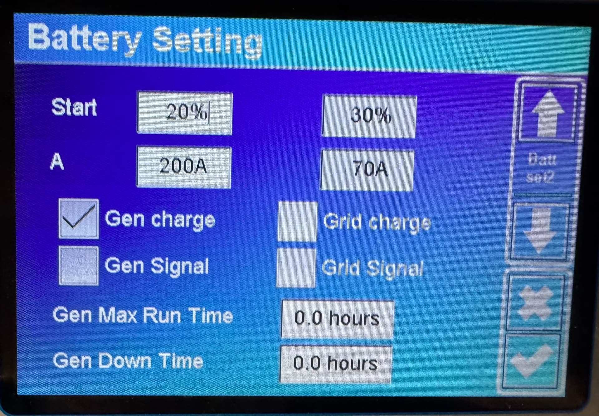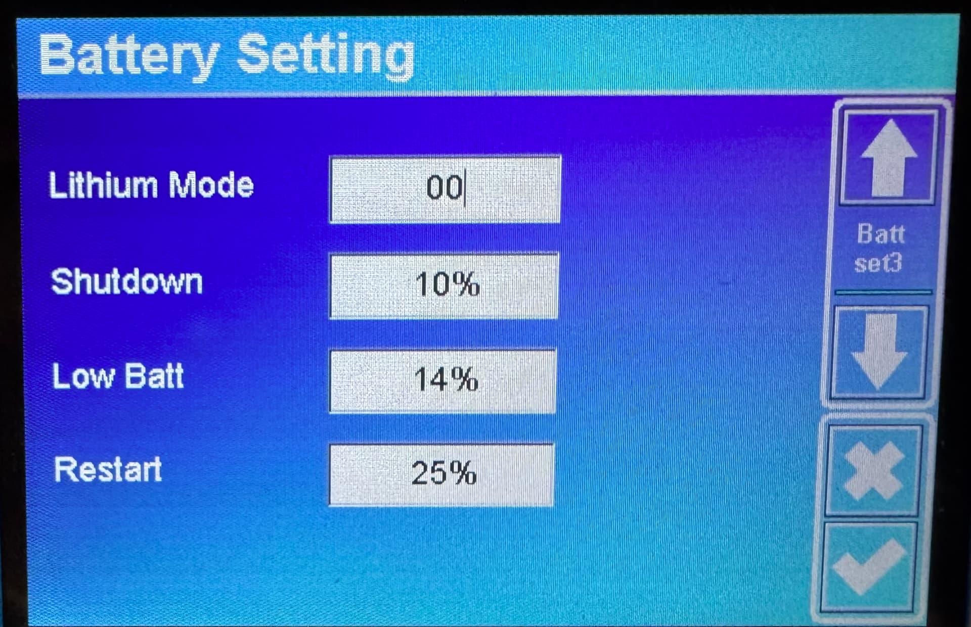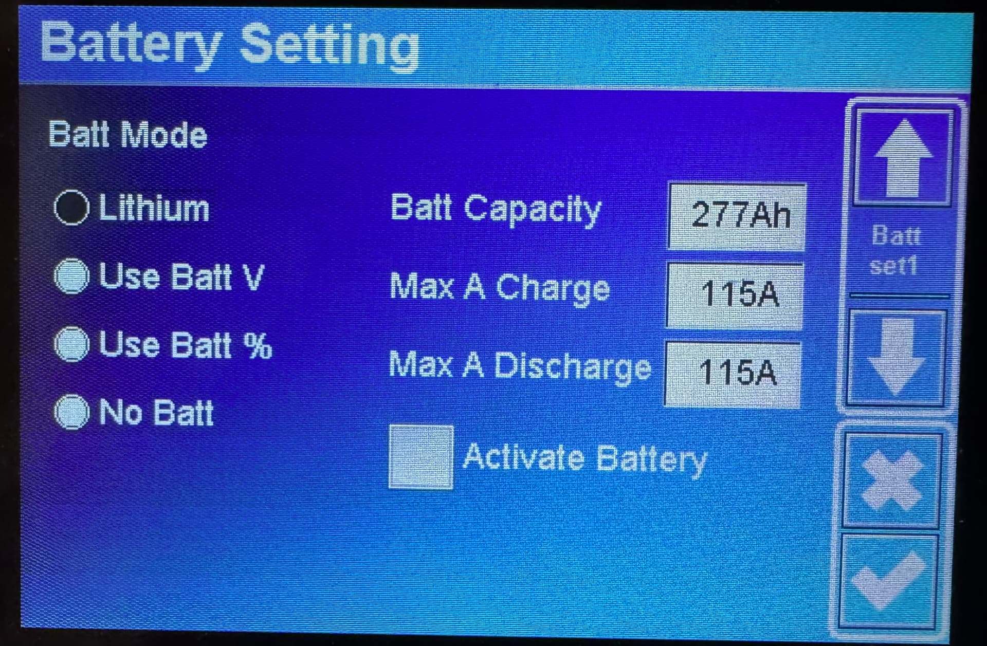 Ich habe in deinen Einstellungen gesehen, dass du die Funktion "Activate Battery" aktiviert hast. Diese Funktion solltest du besser deaktivieren. Die Übersetzung an dieser Stelle ist etwas unglücklich. Die Funktion ist für die Reaktivierung von Bleibatterien gedacht.