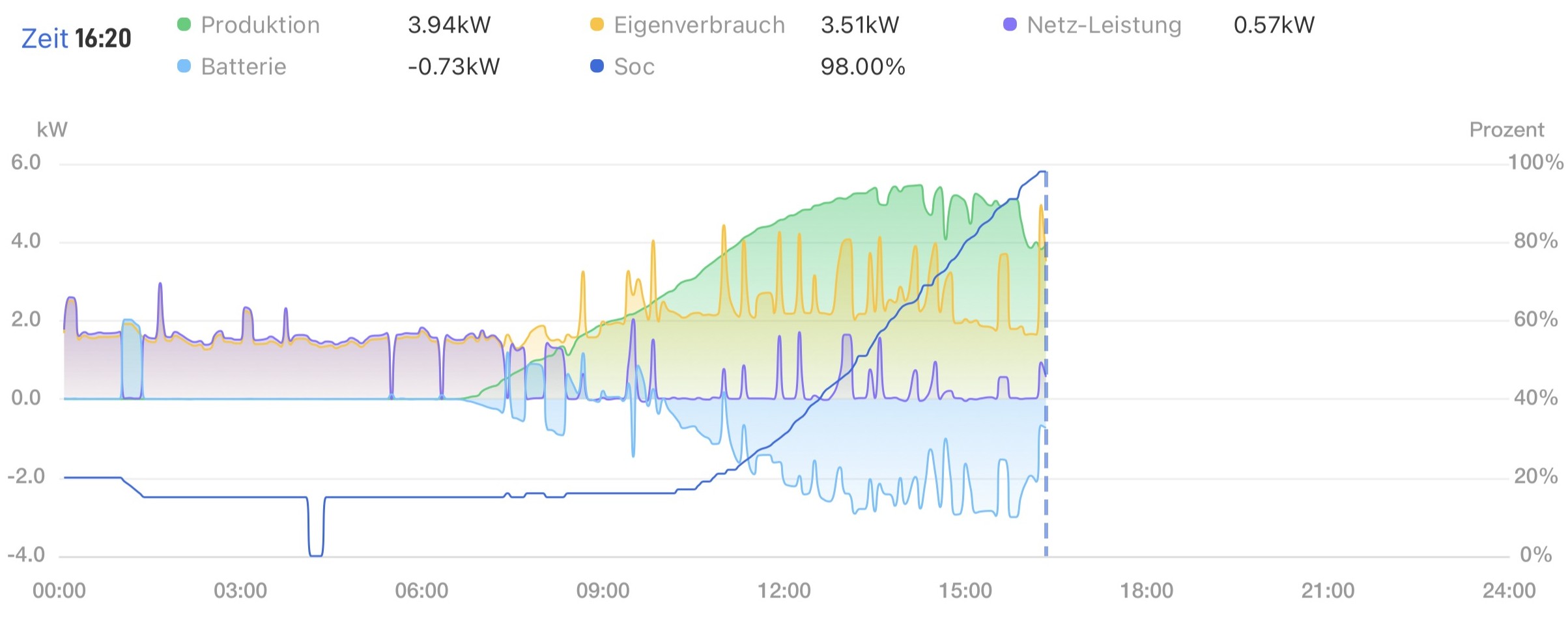 Hätte halt nur gern, dass er auch "dynamisch" auch tagsüber mal läd und auch entläd. Hausverbrauch (gelb) bzw. Netzbezug (Lila) sieht man ja, dass er z.B. bei den Lila Peaks zw. 12 und 15 Uhr eigentlich noch Reserven hat (Grün höher als Gelb), statt dessen aber immer noch in den Akku läd (hellblau) - also irgendwie dominiert die Ladung "etwas".