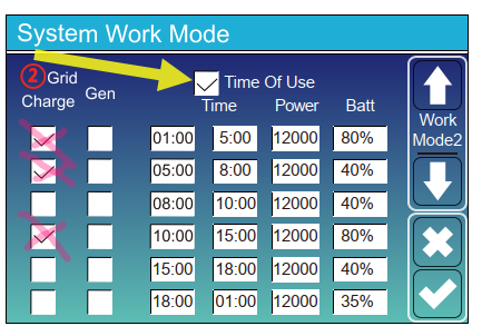Bei ToU wird eingestellt, wann und bis zu welchem Wert (SOC) die Batterie entladen wird. Also Time of Use aktivieren und die Werte für SOC wie gewünscht einstellen. Und nicht vergessen auf der nächsten Seite die Wochentage auswählen.