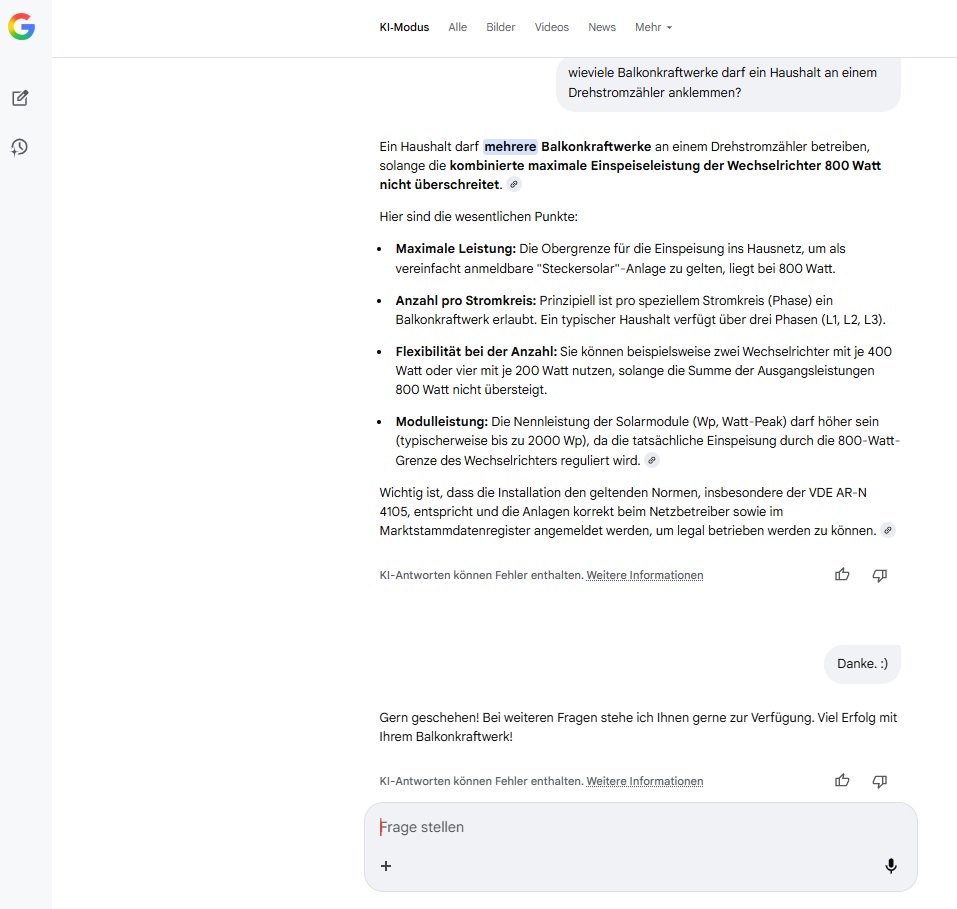 Ja aber du darfst anscheinend pro phase ein Balkonkraftwerk anschliessen. Weil im Gesetz steht eins oder mehrere. ob das jetzt dann auch mehr als 3 sein dürfen weil es Sicherheitstechnisch kein Problem ist weiss ich nicht. Laudeley hatte doch mal son Ding gebastelt. Vielleicht zählt das ja als mehrere, wenn du die alle an einen Baustromverteiler 3x32A anschliesst. Das werden ziemlich viele.Und es hat einen Stecker.