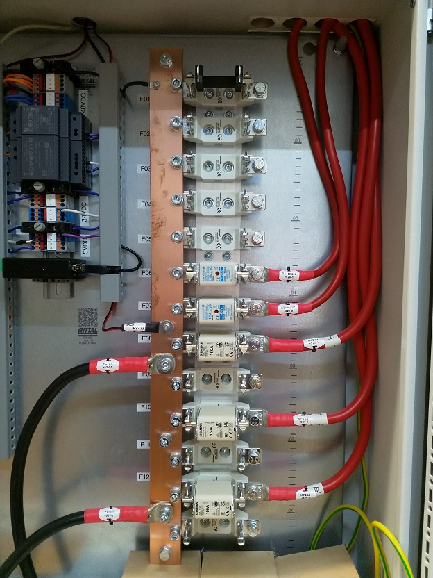 Wer gern NH Trenner verwendet - gibt alles. Die werden dann über oder unter der Stromschienen montiert. Ich würde 2 polige NH Lasttrenner für DC andenkrn