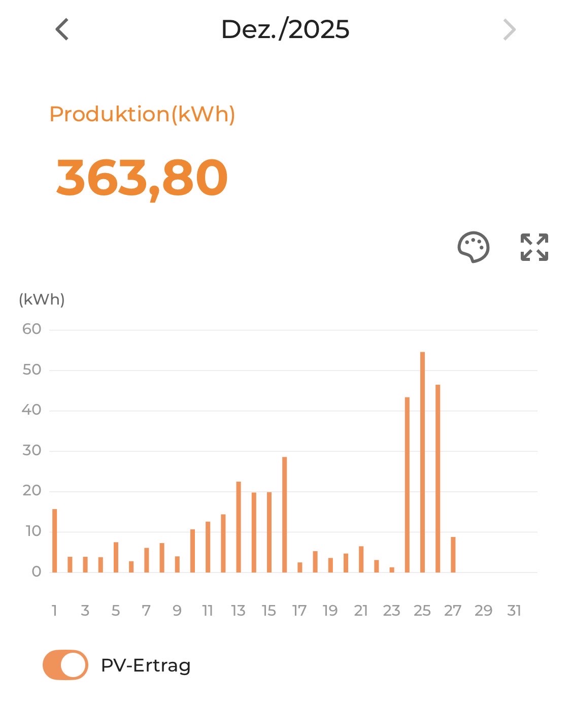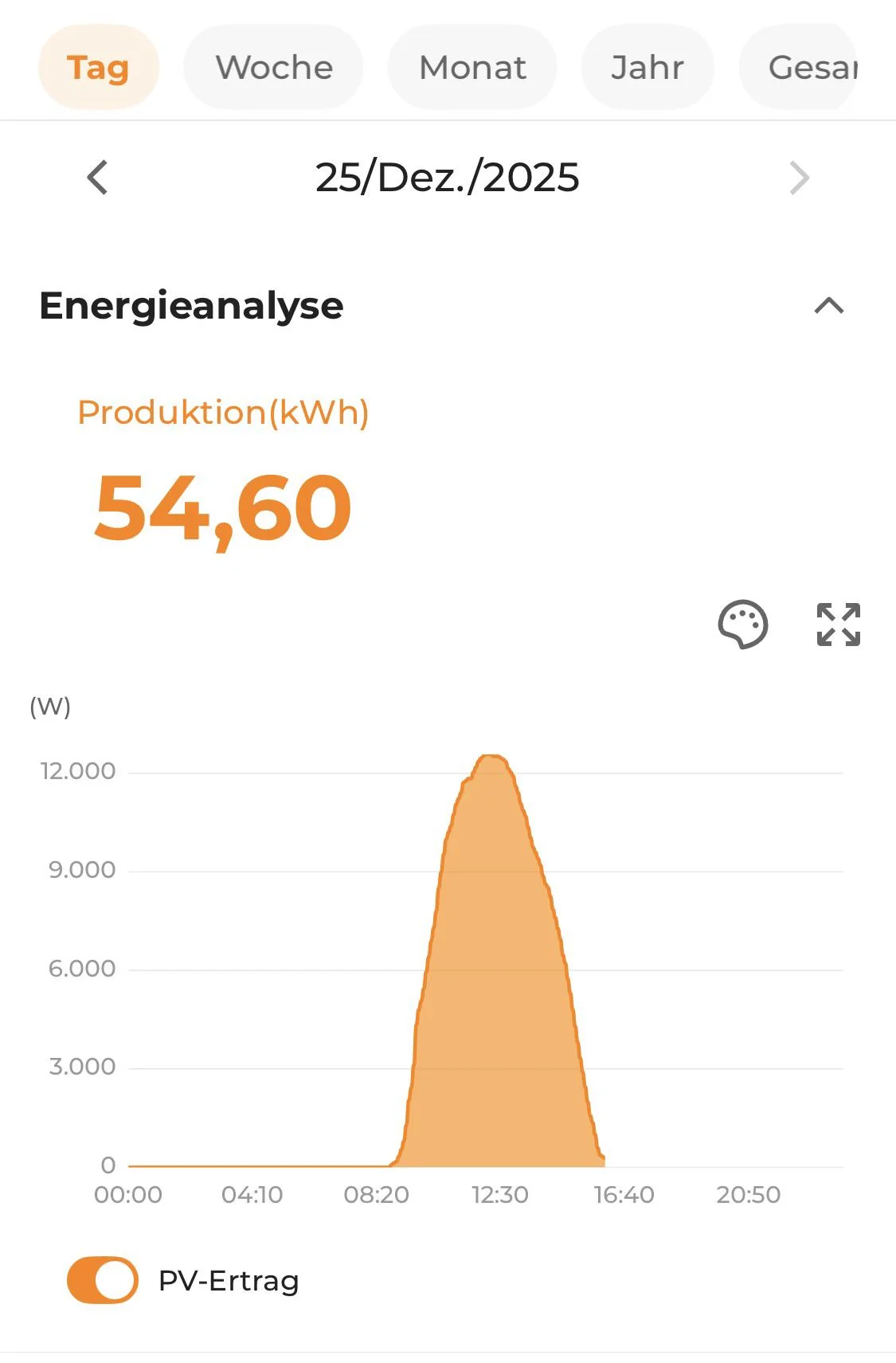 Durch den hohen Eigenleistungsanteil und die günstige Beschaffung der Komponenten ist die Anlage sehr wirtschaftlich geworden. Ein Speicher ist aktuell noch nicht verbaut; die reine PV-Anlage rechnet sich bereits sehr gut. Hier auch noch zwei Bilder vom besten Tag überhaupt und vom besten Winter Tag. Beides sehr beeindruckend (finde ich). Ach ja, Ausrichtung 158° Süd und Dachneigung 43°.