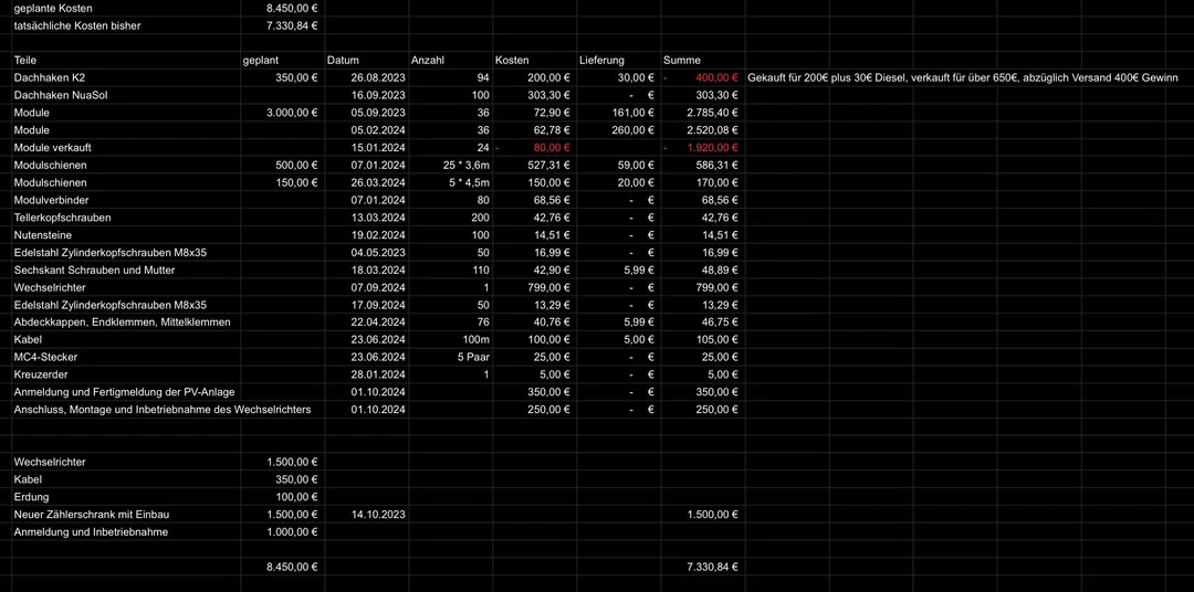 Die Montage der Module und die komplette DC-Seite habe ich selbst umgesetzt. Details sind in der Kostenübersicht zu sehen.