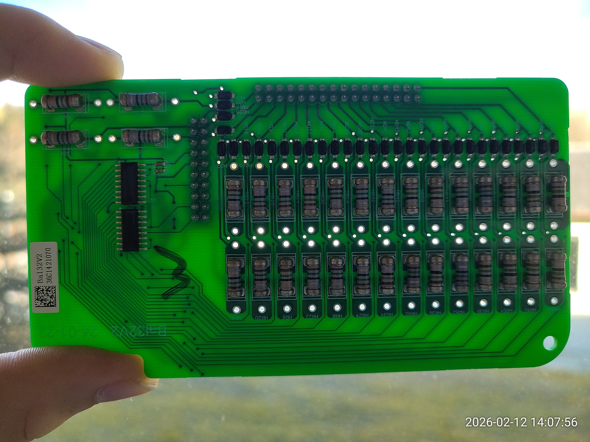 Im Foto ist die durchleuchtete Balancing-Platine zu sehen. Trennabstände sind quasi nicht vorhanden. An der linken Stiftleiste kommen die Ansteuerleitungen (auf 24V-Potenzial des Netzteils), auf der oberen Stiftleiste kommen die HV-Potenziale aus den Zellen rein.
