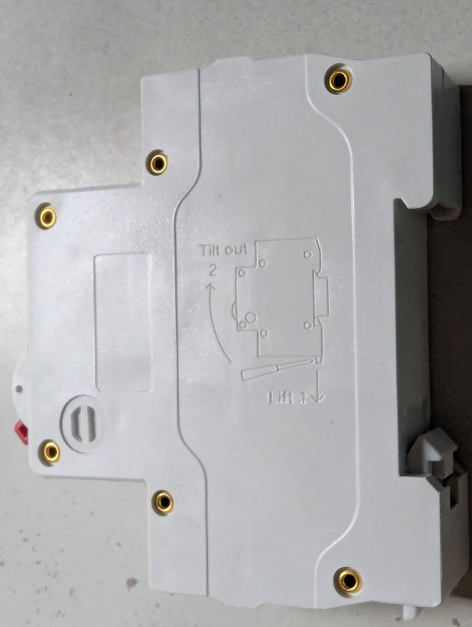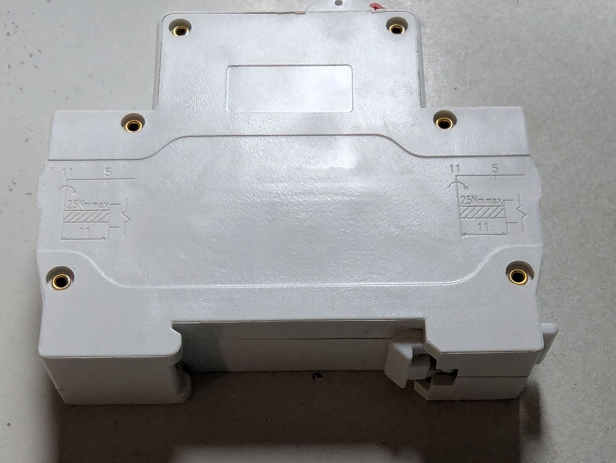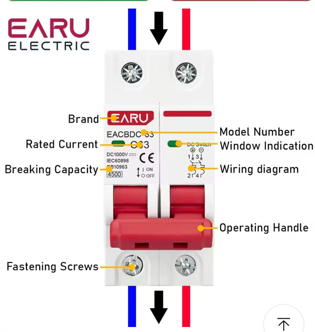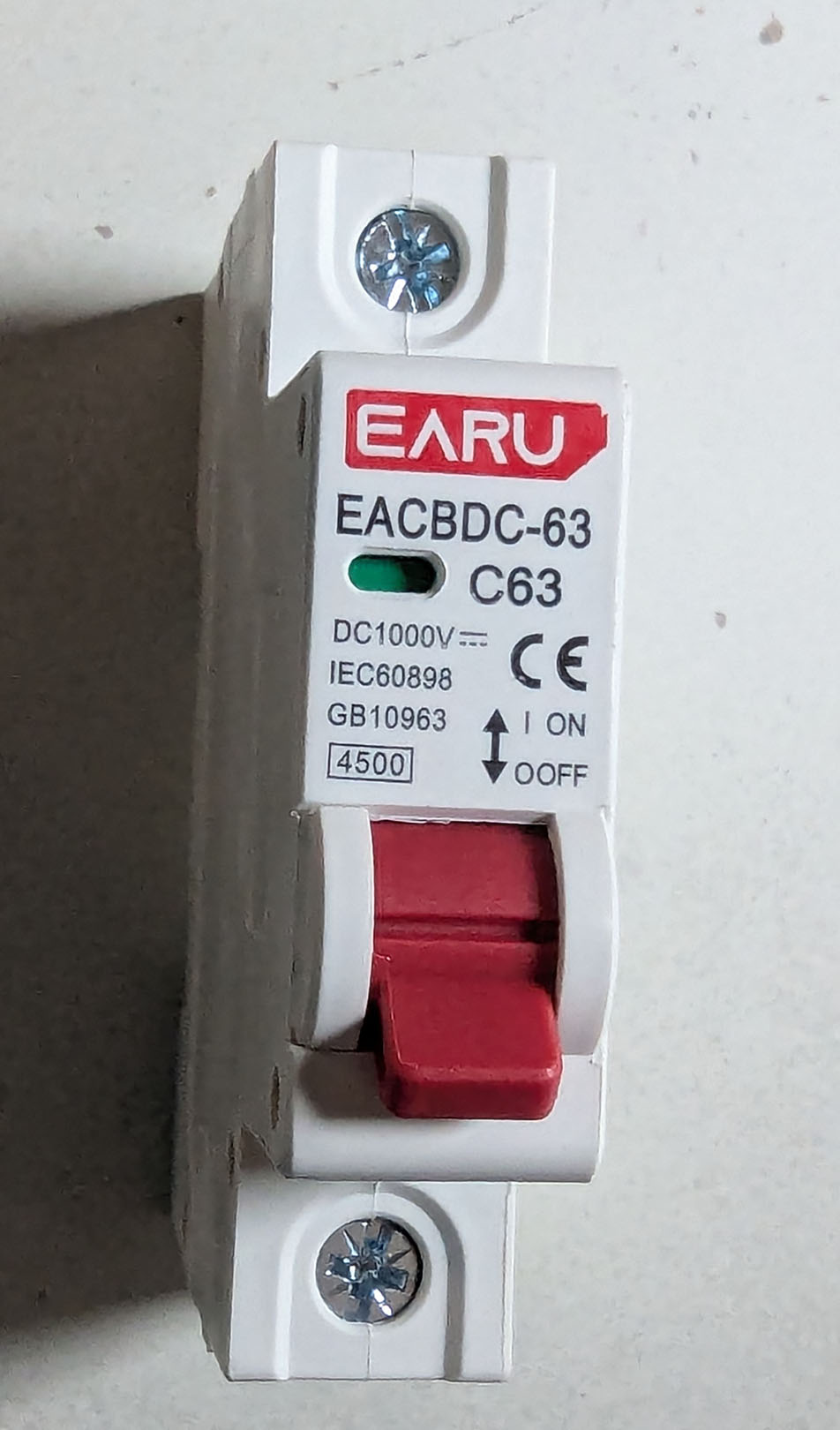 Typ: EACBDC - demnach müßte die Stromrichtung von oben nach unten sein - ist aber nichts aufgedruckt. Ist auch kein Doppel-MCB für Plus und Minus-seite, sondern nur 1-polig.