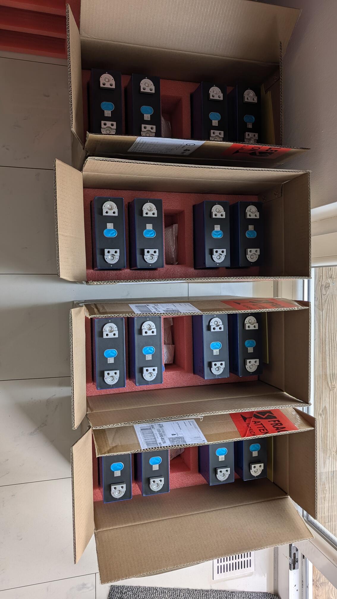 also meine zellen sind auch vor einigen tagen gekommen. bin aber erst heute von einer reise zurück gekommen. habe eben alle durchgemessen und inventarisiert. jetzt warte ich noch auf das gehäuse und dann werde ich wohl nochmal darüber nachdenken müssen ob ich deye oder victron verbauen möchte ![]()