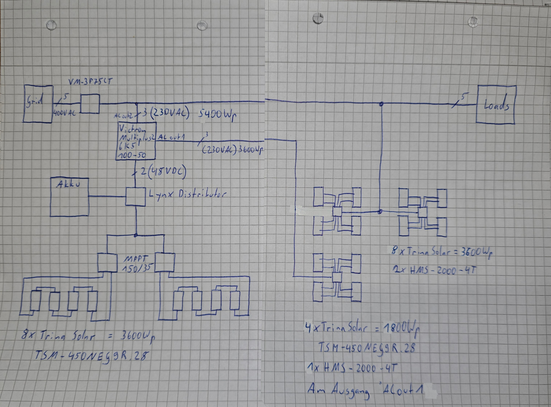 Und ich würde durchaus auch die MPPTs mischen. Sprich ein Mix aus Victron Ladereglern, die direkt in die Batterie gehen, und / oder mind. 1 HMS-2000-4T an den AC-Out für kritische Lasten, damit im Falle eines Netzausfalls der noch mit produzieren kann. die HMT am AC In sind in dem Falle ja direkt tot.