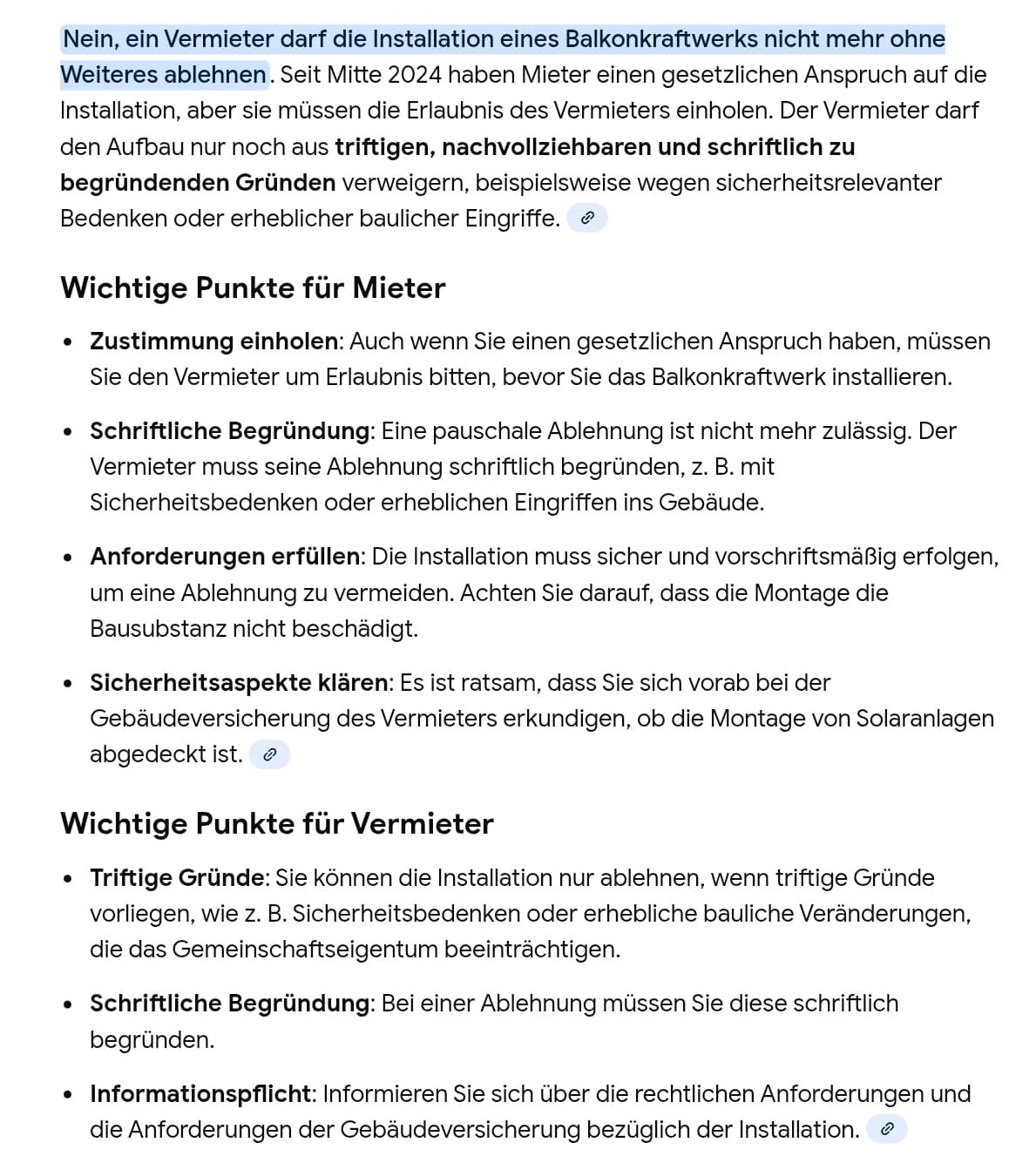 Soweit mein Kenntnisstand ist, darf ein Vermieter ein BKW nicht ablehnen, Ausnahmen sind da nur Denkmalschutz. Technische Bedenken? Jede Balkonsteckdose ist normalerweise separat abgesichert. Was soll denn da bei 800W Einspeisung passieren? Einziger Einwand wäre eventuell eine Wielandsteckdose. Die kann man schnell mal gegen die Feuchtraumsteckdose austauschen. Für WR gibt es dafür vorkonfektionierte Kabel oder man wechselt einfach nur den Stecker aus. Solange aber immer noch steckerfertige BKW verkauft werden, fällt das als Ablehnungsargument in meinen Augen aber weg.