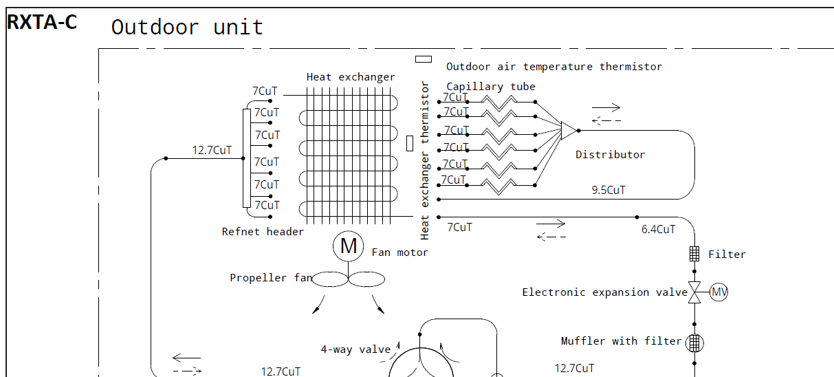 Nein, die Panasonic entspannt das KM im Expansionsventil, leitet es dann durch 2-4 Rohrschlangen unten im Verdampfer und danach geht es erst in den Verteiler und die Kapillaren.