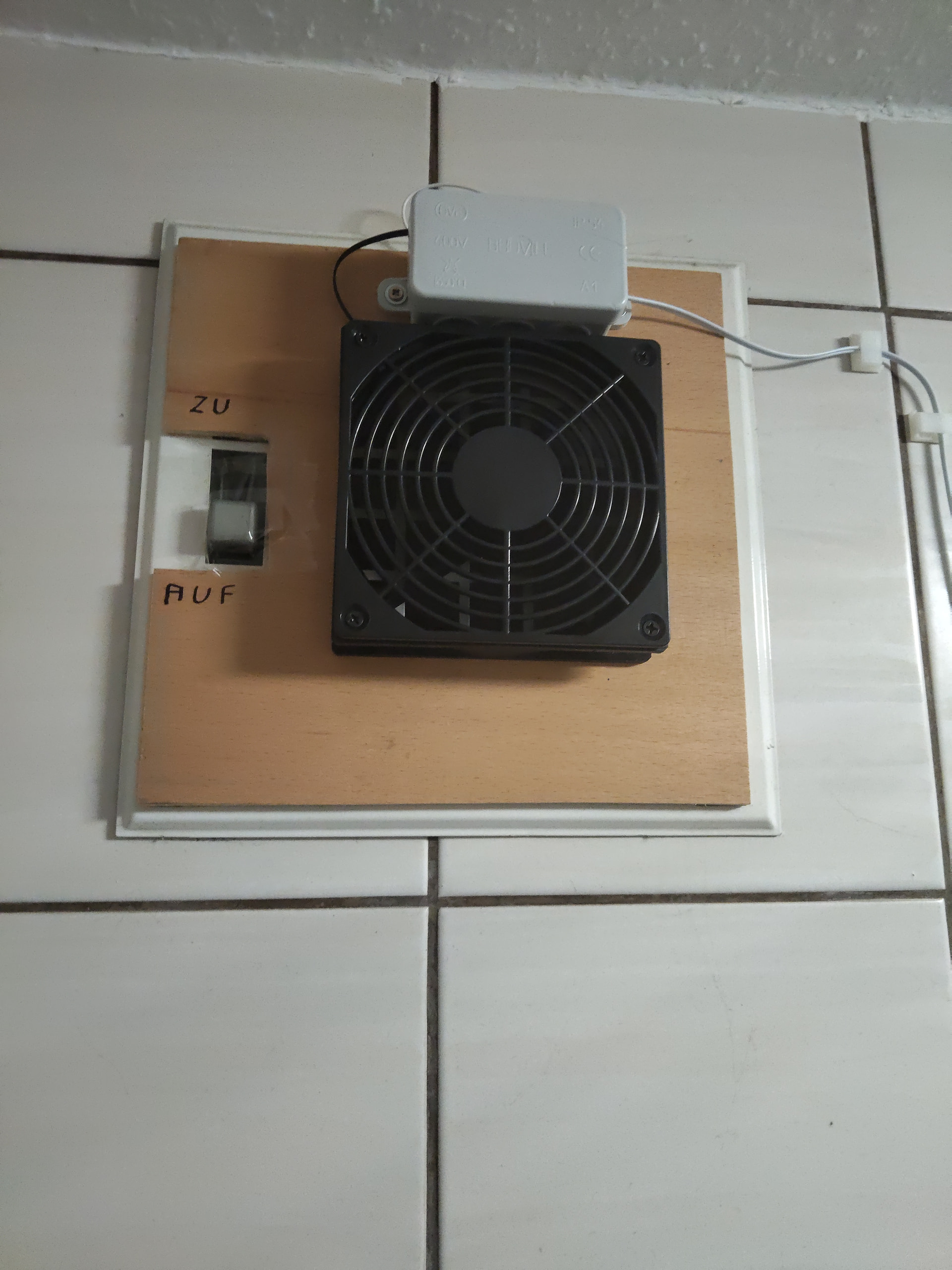 In meinem Fall ein 12 V Lüfter (Artic P12 (cm)) der im Bad die Luft durch ein Lüftungsrohr in der Außenwand nach Außen drückt.