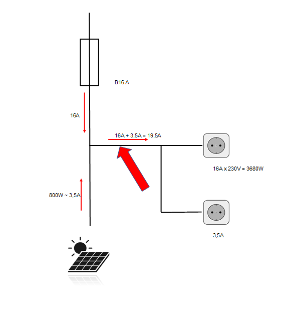 Dadurch, dass 16A aus Richtung des Sicherungsautomaten bezogen werden können ohne das dieser auslöst (B16 löst auch beim 1,13 fachen des Nennstroms noch nicht aus wenn die Raumtemperatur 30°C nicht überschreitet), und das gerade 800Watt also ca. 3,5A vom Balkonkraftwerk bezogen werden können ist der Teil der Leitung die mit dem dicken roten Pfeil gekennzeichnet überlastet da hier die Summe aus Richtung B16 und BKW = 19,5A fließt.
