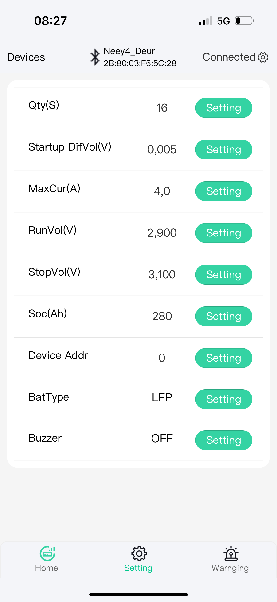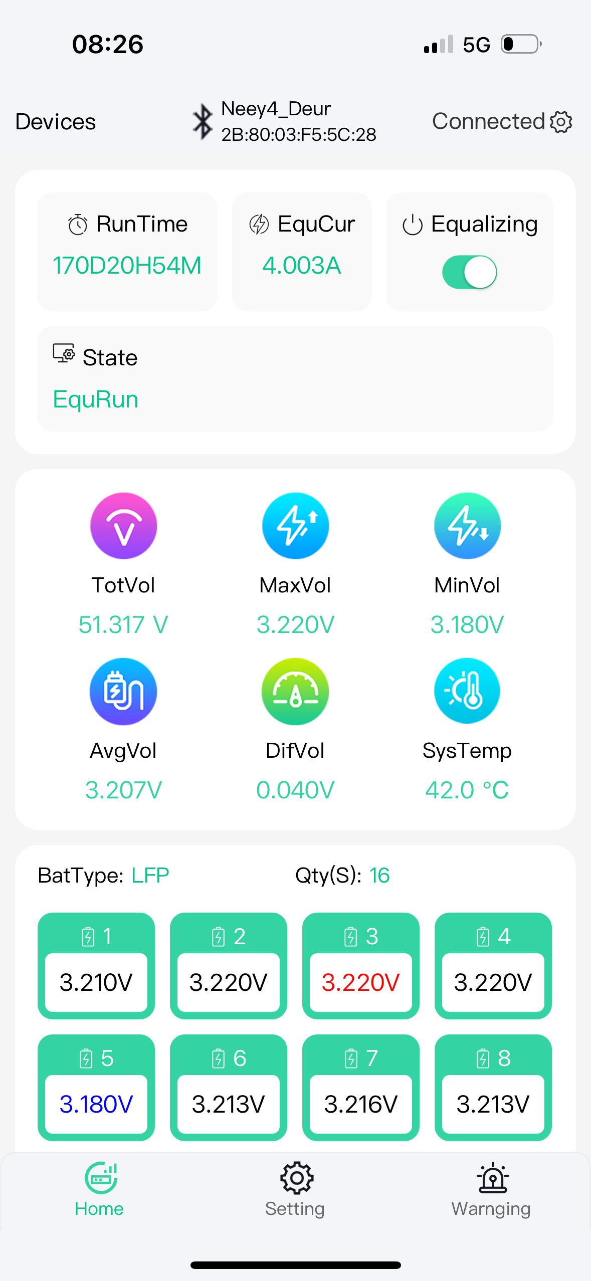 Ich hab jedoch festgestellt, dass der NEEY zwar erst ab der einstellbaren Zelldifferenz (Startup DifVol) loslegt wenn denn auch RunVol erreicht/überschritten wurde, er balanciert jedoch solange bis Zelldifferenz irgendwo bei 5mV liegt. Es ist m.E. also nicht einstellbar, dass er unterhalb von 25mV Zelldifferenz auch wieder aufhören kann. Tante edit: Gestern noch mal nachgeschaut, ich muss mich korrigieren. Ich hab eine StartDifVol von 25mV eingestellt, wenn alle Zellen (derzeit insgesamt 48 in drei Packs) unterhalb der 25mV liegen stoppt er das Balancieren ordnungsgemäß.