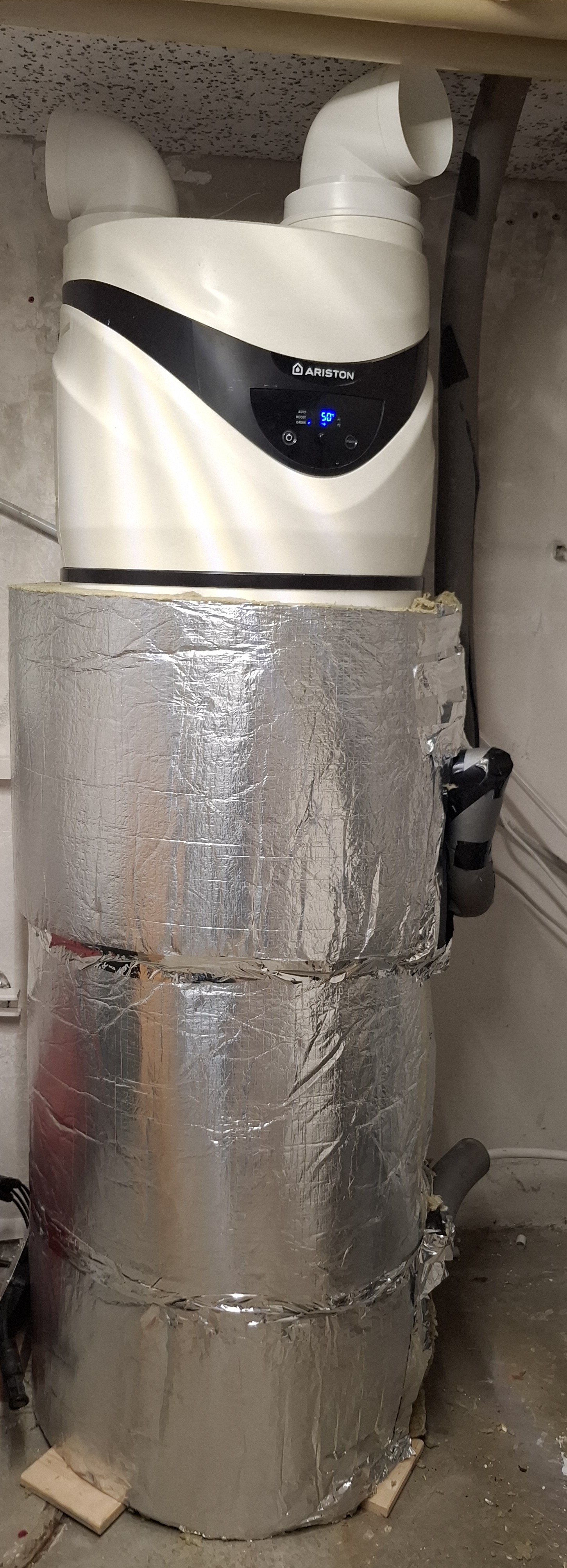- Ich habe eine Ariston mit 80l. Von der Stelle (Kellertreppe), an der meine Wechselrichter, die Laderegler und die Batterie hängen, habe ich bis zur BWWP einen Abluftschlauch gezogen. Sieht ein bisschen aus wie in der ISS. Funktioniert scheinbar, denn wenn ich die Zulufttemperatur an der BWWP (P4) anzeigen lasse, sieht man eindeutig, dass die Luft viel wärmer ist, als an der Stelle, wo die BWWP im Keller hängt. Vielleicht bringt das ja was.