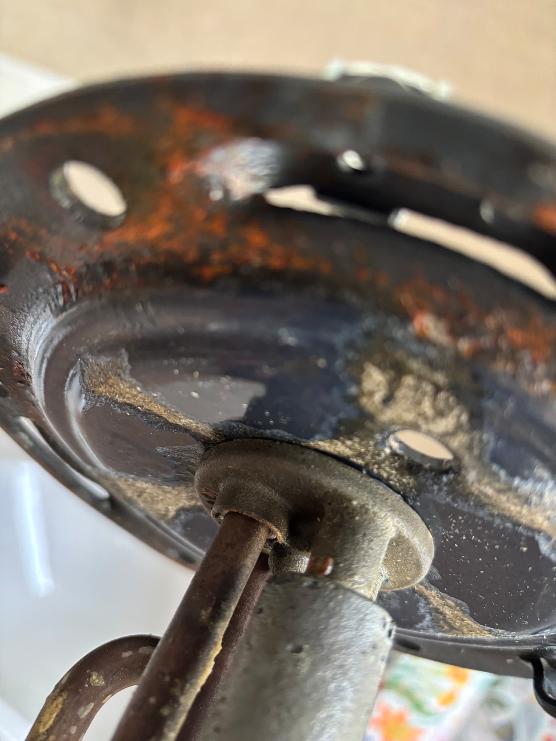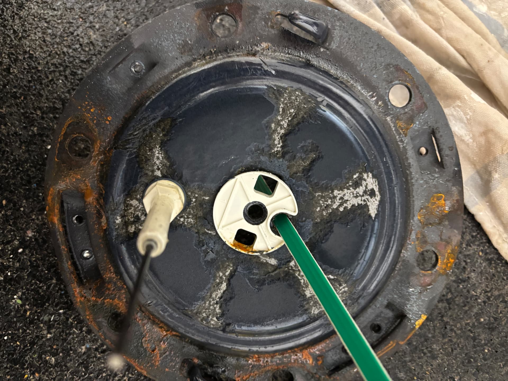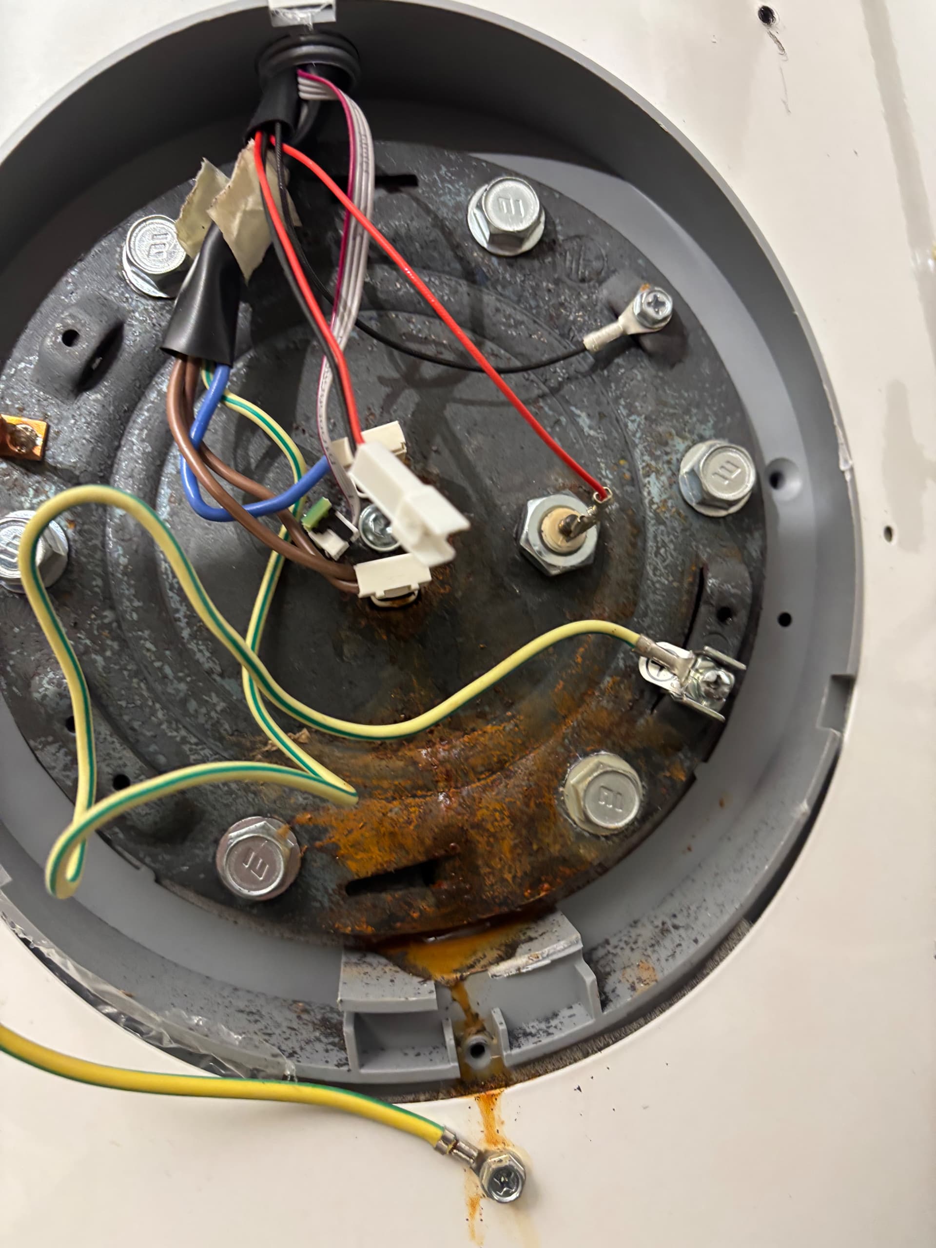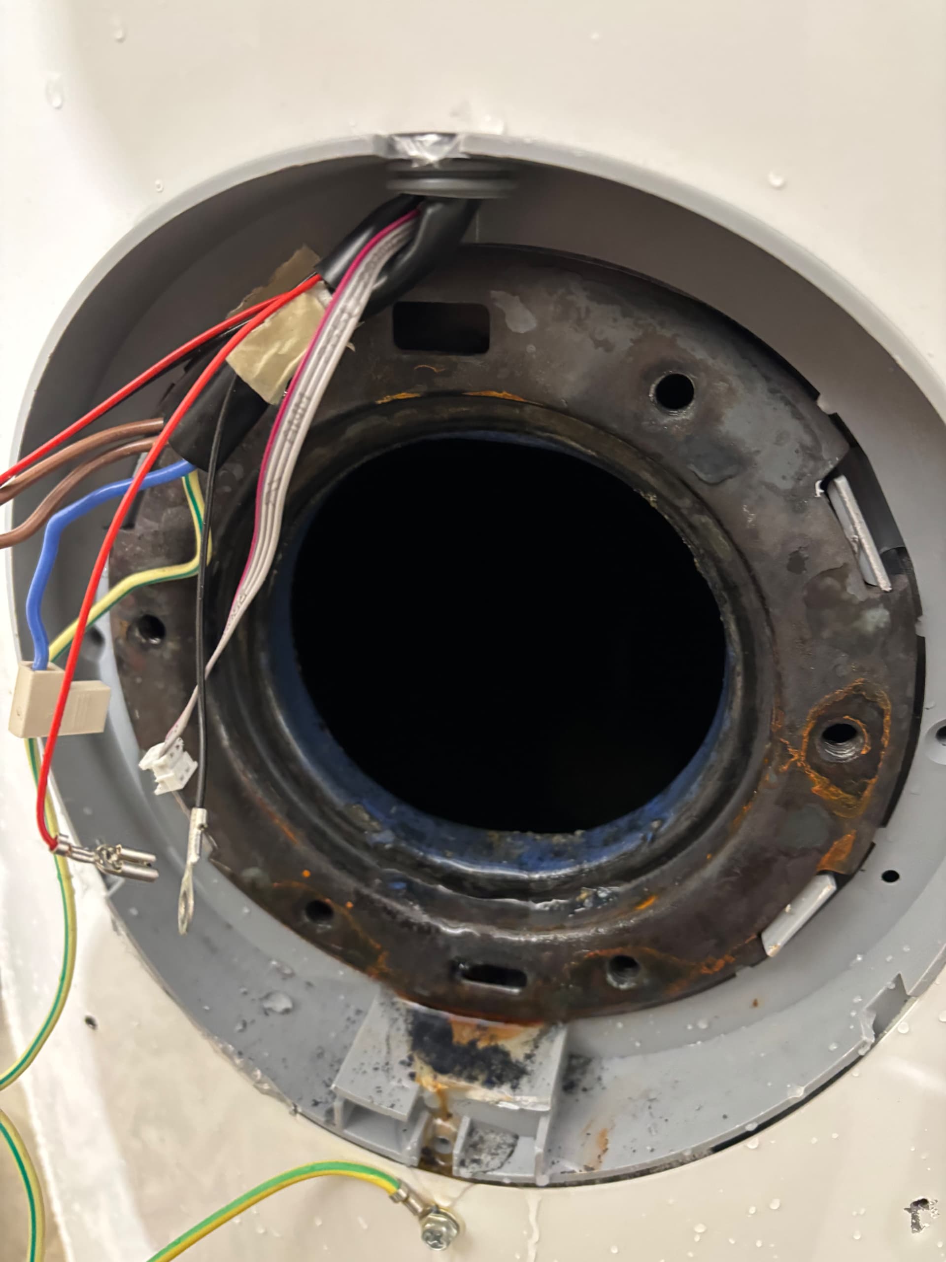 Die Emaille scheint großflächig beschädigt zu sein. Zwischen den Dichtungsringen und dem Flansch befinden sich Emaille-Splitter. Insgesamt macht das qualitativ keinen guten Eindruck.