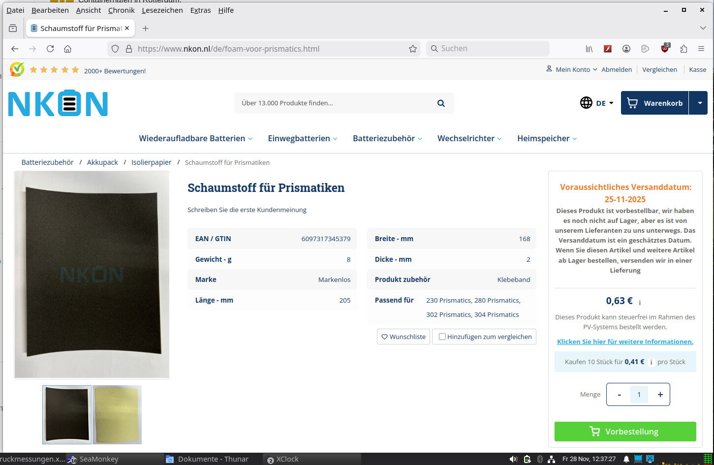 Ich habe schon zweimal prismatische Zellen bei NKON gekauft und war mit der Lieferung sehr zufrieden. Im Moment habe ich aber was (vor-)bestellt, das schon um eine Woche verschoben wurde und im Moment mit einem um drei Tage überzogenen voraussichtlichen Lieferdatum gelistet ist. Das erweckt den Eindruck, daß die Mannschaft dort ziemlich überlastet ist.