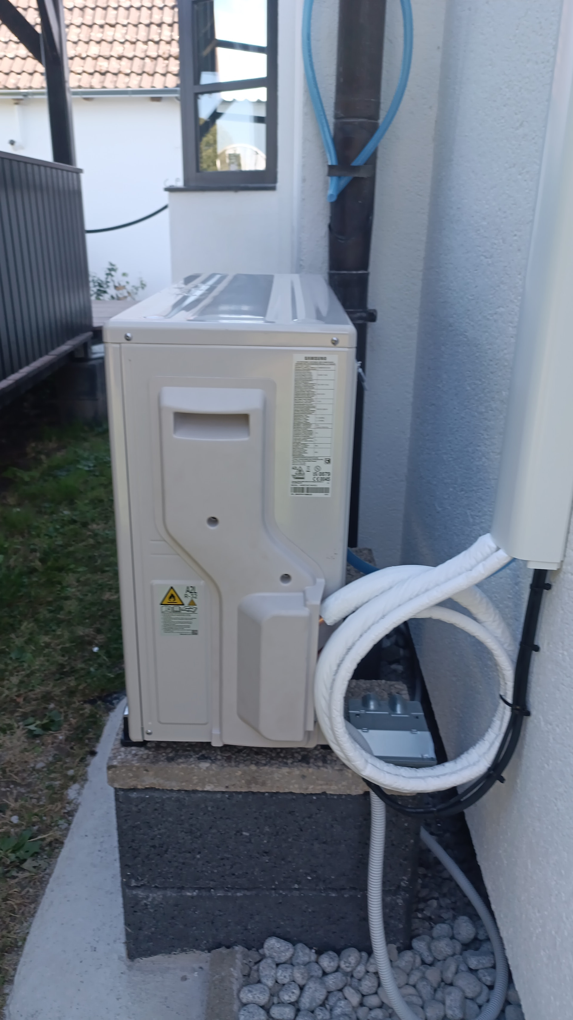 Zur Vorbereitung und Installation kann ich sagen, dass die Kernbohrung dabei eigentlich das Schlimmste war(leider war genau an der Stelle ein Stahlträger im Mauerwerk). Die Kältemittelleitungen habe ich mit einem einfachen Handgerät bebördelt, einen Drucktest mit Heliumballongas durchgeführt und die Anlage dann mit einer günstigen Pumpe evakuiert. Der Stromkreis ist separat abgesichert, zur Sicherheit Stromleitung mit 2,5mm Querschnitt
