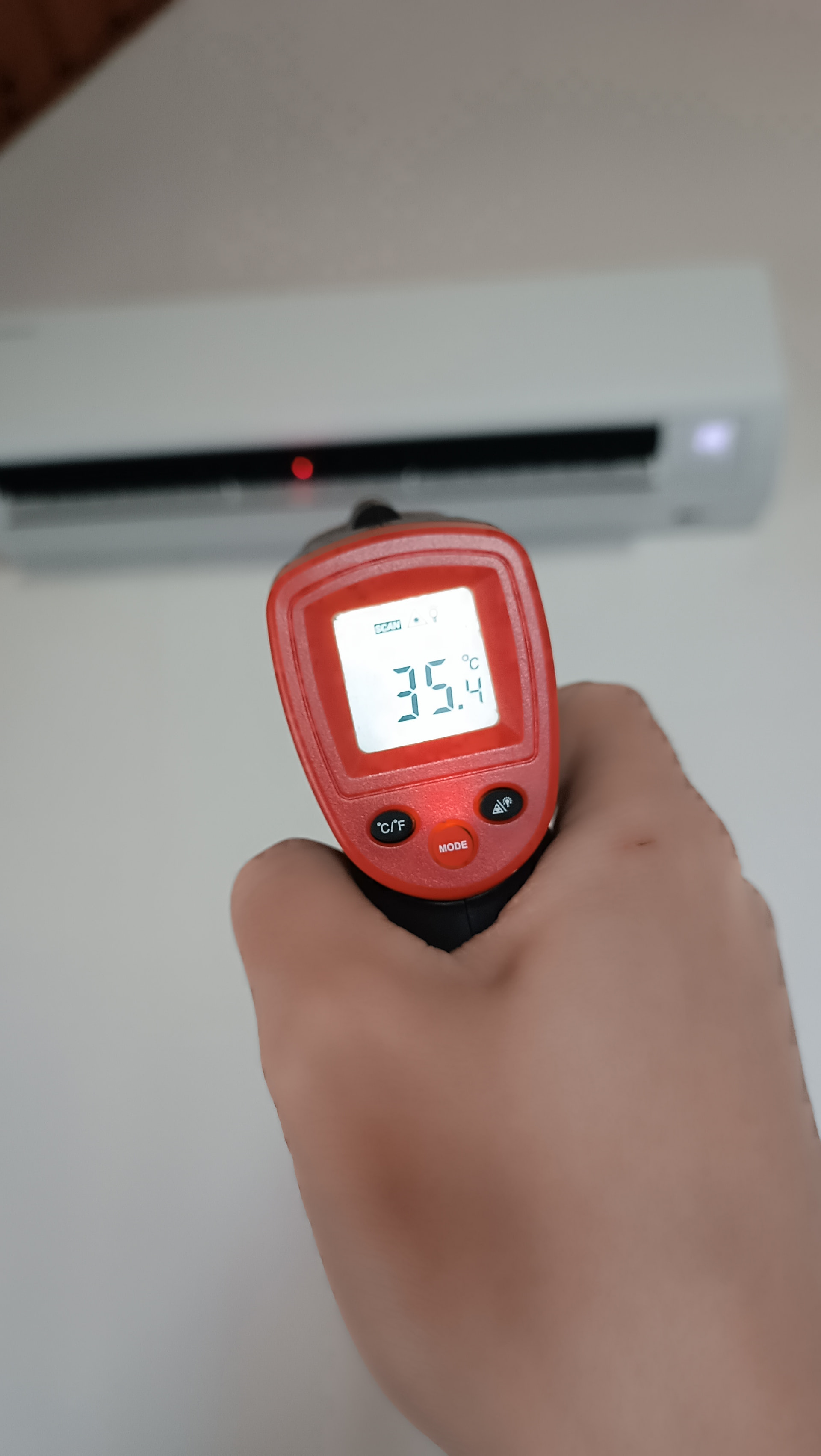 Zur Messung der Auswurftemperatur wirst du sehr viel näher ans Gerät müssen, also so im Bereich 5-10 cm. Bei 1m Entfernung wirst du bestimmt eine Messfläche von 30-50cm haben, wo dann der Mittelwert genommen wird.