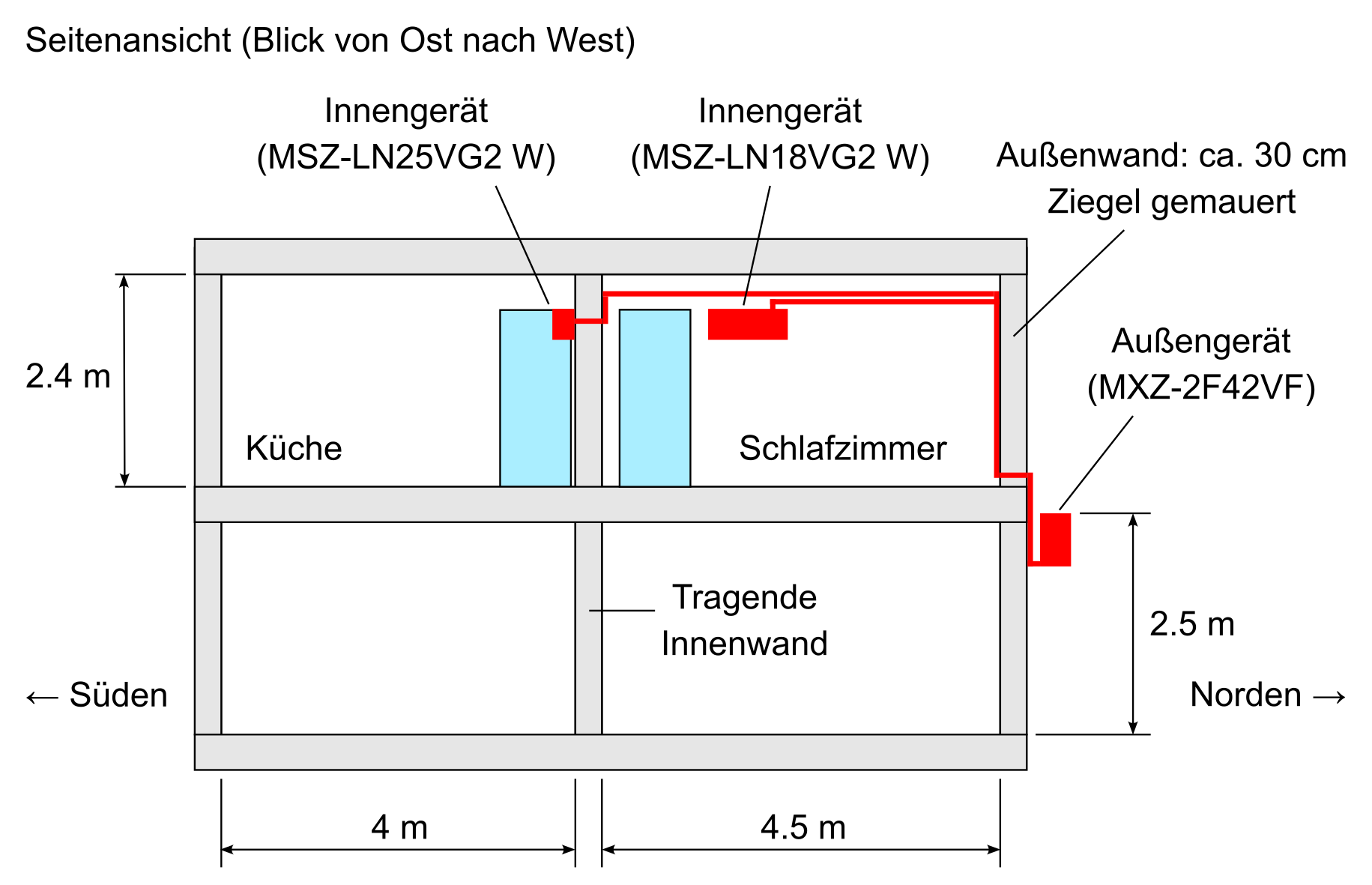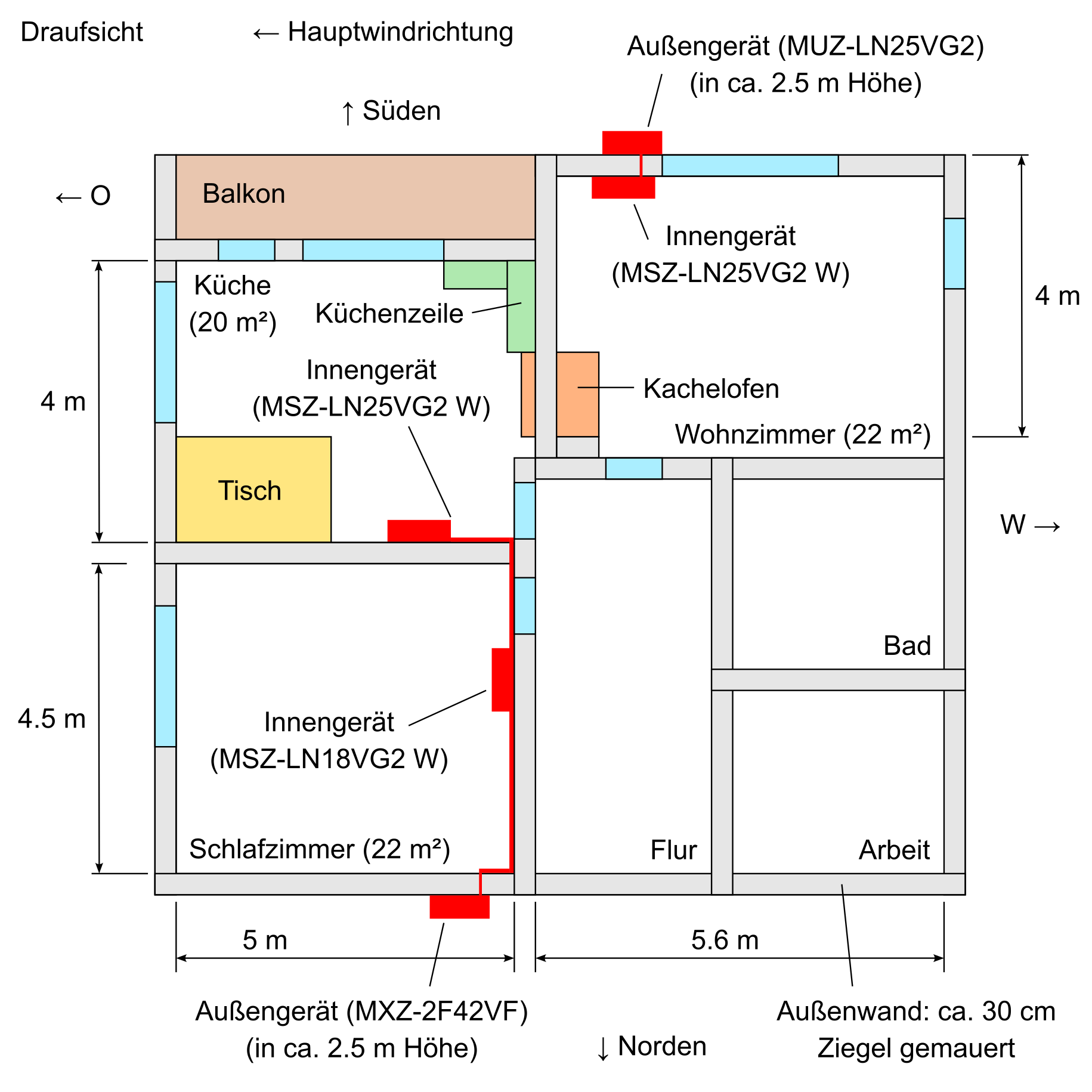 Im ersten Stock sollte eine effiziente und günstige Heizung eingebaut werden. Die Wahl fiel auf Split-Klimaanlagen, da alle anderen Alternativen deutlich aufwendiger und teurer umzusetzen sind. In die drei großen Räume sollten Innengeräte eingebaut werden. In der Küche ist der Platz für das Innengerät praktisch vorgegeben, da über den Fenstern, über der Küche, über dem Kachelofen und über dem Tisch kein Platz ist. Im Schlafzimmer ist die gesamte Innenwand als Platz verfügbar. Diese beiden Innengeräte sollten an ein Multi-Split-Außengerät angeschlossen werden, das an der Nord-Außenwand platziert wird. Im Wohnzimmer sollte das Innengerät direkt auf kürzestem Weg mit einem weiteren Außengerät verbunden werden, das an der Süd-Außenwand montiert wird. Die Platzierung ist in den beiden folgenden Bildern skizziert.