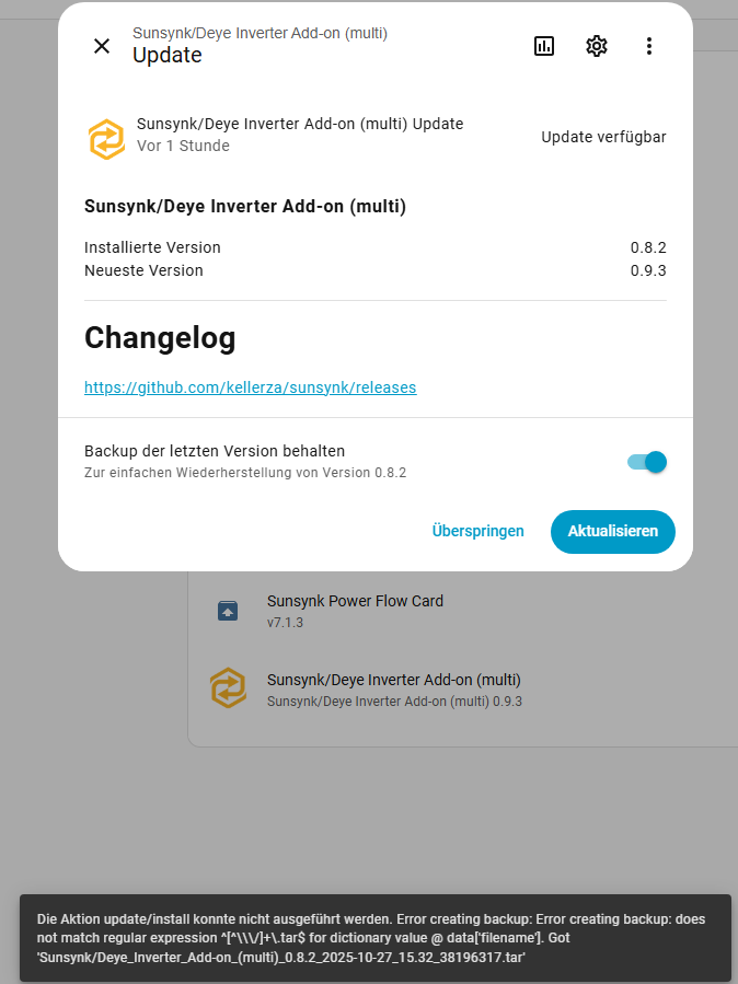beim Versuch das Addon “Sunsynk/Deye Inverter Add-on (multi)” von Version 0.8.2 auf 0.9.3 zu aktualisieren und dabei ein Backup der Version 0.8.2. zu erhalten, bekomme ich die Fehlermeldung “Error Creating Backup: Error Creating Backup: does not match regular expression“: