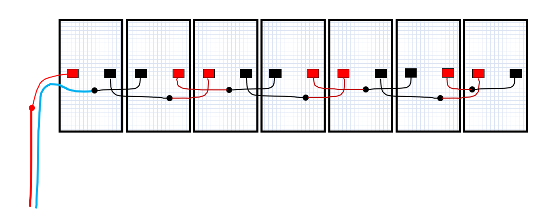 Es gibt eine Verschaltungsart, wo man immer ein Modul überspringt und somit die Kabellängen voll ausnutzt. Dadurch kann man die Rückleitung über die übersprungenen Module direkt zurückführen OHNE deine Rückleitung.