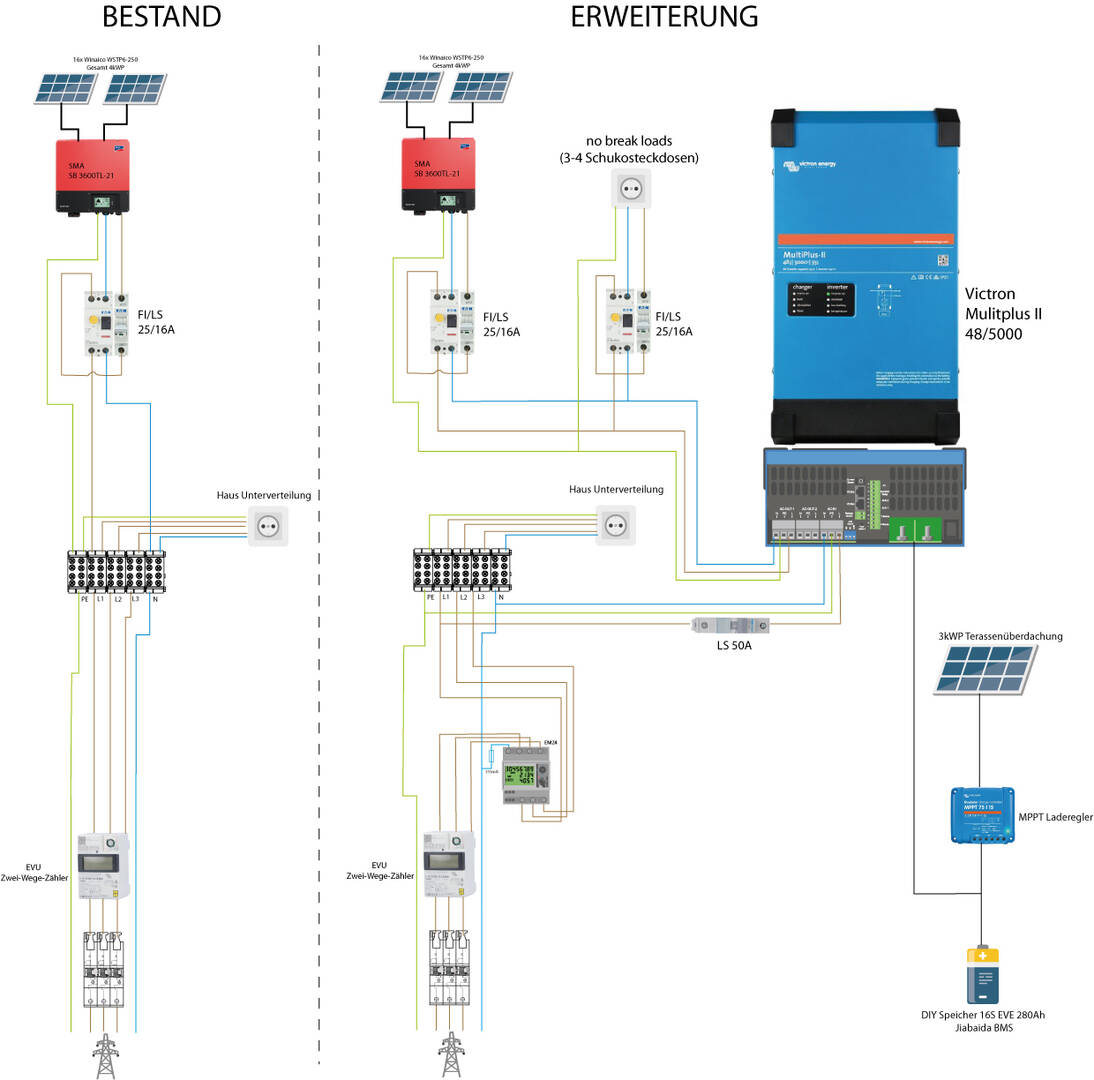 ich habe aktuell eine 4kWp Anlage auf dem Dach mit 1-phasigen SMA Wechselrichter, die ich nun um ein Victron-ESS mit DIY Batteriespeicher und PV-Terassenüberdachung erweitern möchte. Den bestehenden Wechselrichter möchte ich dabei am AC-Out 1 des Multiplus betreiben damit dieser bei Netzausfall weiterläuft bzw. auch Schwarzstartfähig ist. Ebenso sollen am AC-Out 1, 3-4 Steckdosen angebracht werden um dort Notstrom abgreifen zu können. Ich habe den Vergleich vorher/nachher mal aufgezeichnet (DC-Seite der Einfachheit halber nicht allpolig).