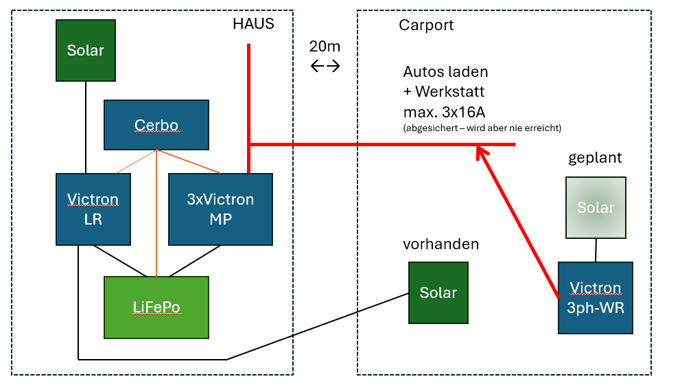 Nun die Frage: Wie am besten? DC gekoppelt - dann müsste ich die DC-Leitung erweitern und einen entsprechenden Laderegler im Haus ergänzen oder AC gekoppelt - mit einem 3Phasen WR über die vorhandene 5-Draht-230V-Leitung. Ist die vorhandene Anlage fähig die AC-Carport-Leistung in meine Batterie zu speichern? Kann das Cerbo die Leistung vom Carport erfassen?