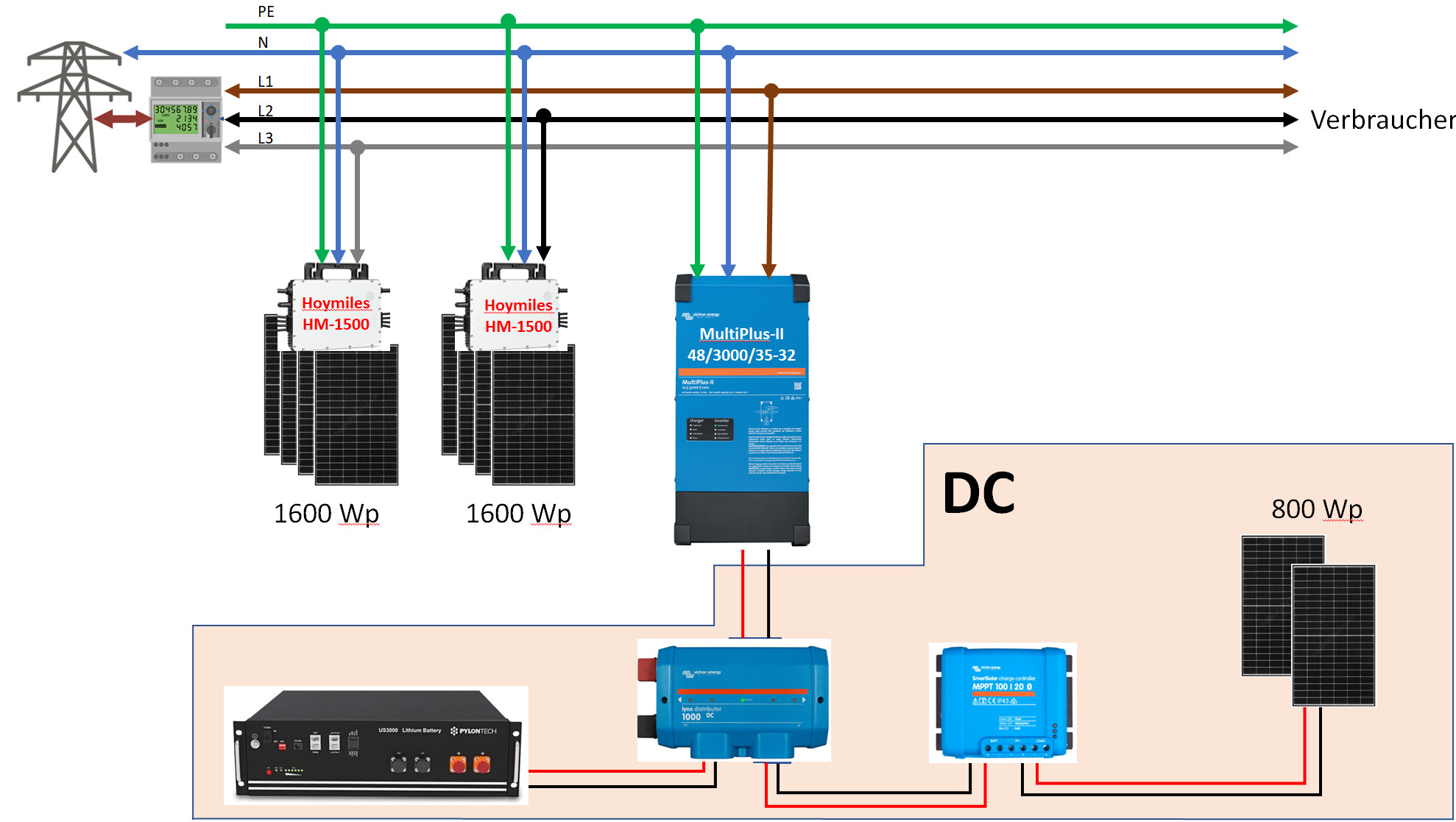 bei mir ist der Aufbau ähnlich. Ich habe einen Multiplus II 5000/48 und lade zwei Pylontech US5000 hauptsächlich über zwei Victron Ladregler. Am AC Out des Multiplus hängt aber auch ein Hoymiles 1500 mit vier Panels als Balkonkraftwerk.