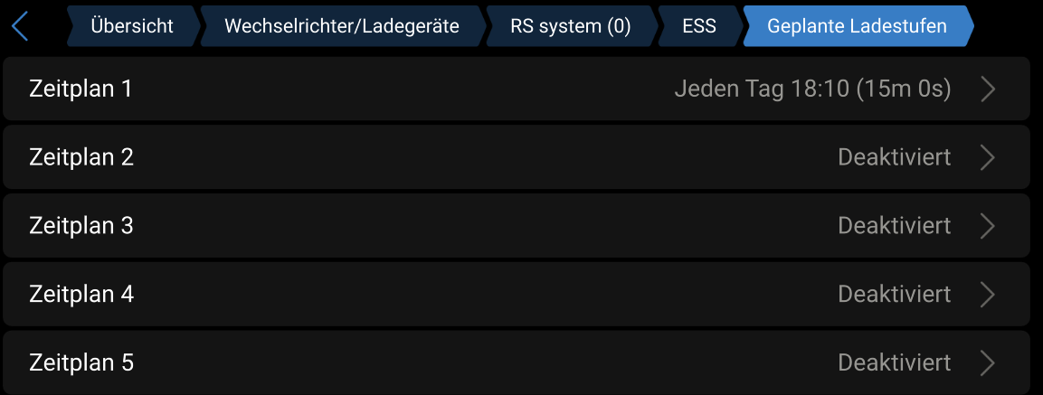 Die Ladestufen über Einstellungen/SystemSettup/ESS eingestellt: